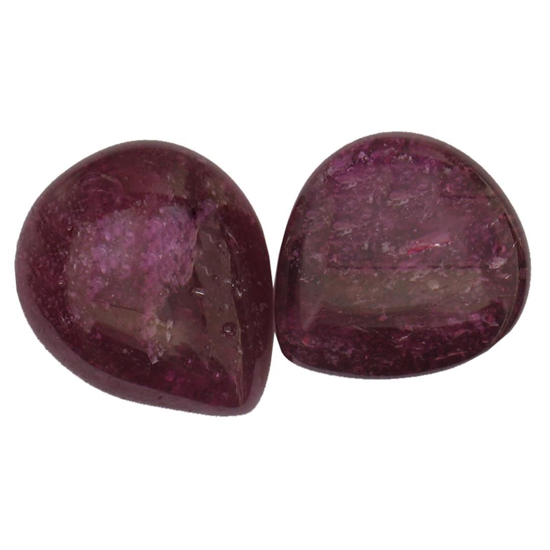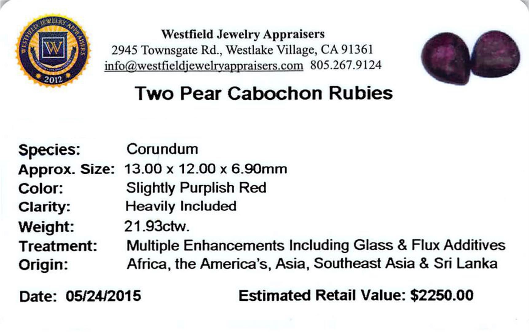Two pear cabochon cut natural rubies, measuring 13.00 x 12.00 x 6.90mm, exact total weight 21.93ct., clarity is heavily included, type II, dark, very slightly brownish, slightly purplish red color, (GIA slpR 7/3), cut is good. Transmitting light diffusely, opaque. Naturally occurring internal & external characteristics are present. Indications of laboratory high temperature heat treatment, with glass & flux additives. Ruby has a low tolerance to rhodium plating, repolishing the surface, & ultrasonic cleaning._x000D_ Westfield Appraised at $2,250.00.