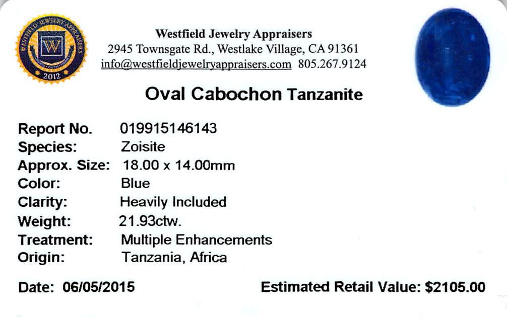 One oval cabochon cut natural tanzanite, measuring 18.00 x 14.00 x 8.50mm, exact weight 21.93ct., clarity is heavily included, type I, dark, very slightly grayish, blue color, (GIA B 7/3), cut is good. Transmitting light somewhat diffusely, transparent to translucent. Naturally occurring internal & external characteristics are present. Indications of heat treatment. Westfield Appraised at $2,105.00.