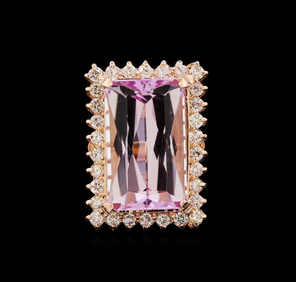 One electronically tested 14KT rose gold lady's cast fashion ring with a basket halo with a bright polish finish. The featured lady's ring has a shank measuring 3.91 millimeters in width. Identified with markings of "14K". Condition is new, good workmanship. Containing: One prong set emerald modified mixed cut natural kunzite, measuring 21.57 x 13.20 x 8.61mm, (depth est.) approximate weight of 21.94ct., clarity is eye clean, light, moderately strong, purple red color, (GIA PR 3/4), cut is very good. Transmitting light with no distortion, transparent. Colored gemstones are presumed to have been subjected to commonly used enhancement processes. Graded in the setting. Thirty prong set round brilliant cut diamonds, measuring 2.40 - 2.30 x 1.46mm (depth est.) approximate total weight of 30 Stones = 1.49ct. Graded in the setting. Clarity: VS-2 to SI-1. Color: H - I. Cut Good. Total Weight of Colored Stones 21.94ct. Total Weight of Diamonds 1.49ct. Total Weight of Ring 15.70gm. GAS Appraised at $10,075.00.