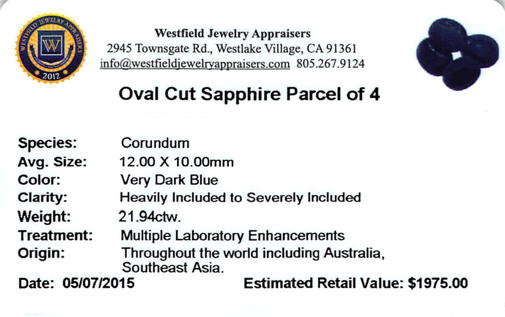 Four oval cut sapphires, measuring 12.00 x 10.00mm, approximate total weight of 21.94ct., clarity is heavily included to severely included, very dark blue color. Indications of multiple laboratory enhancements. Westfield Appraised at $1,975.00.