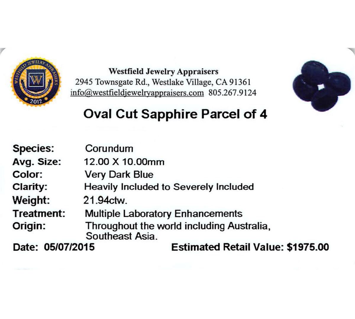 Four oval cut sapphires, measuring 12.00 x 10.00mm, approximate total weight of 21.94ct., clarity is heavily included to severely included, very dark blue color. Indications of multiple laboratory enhancements. Westfield Appraised at $1,975.00.