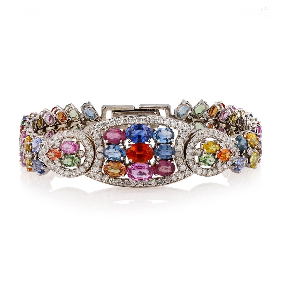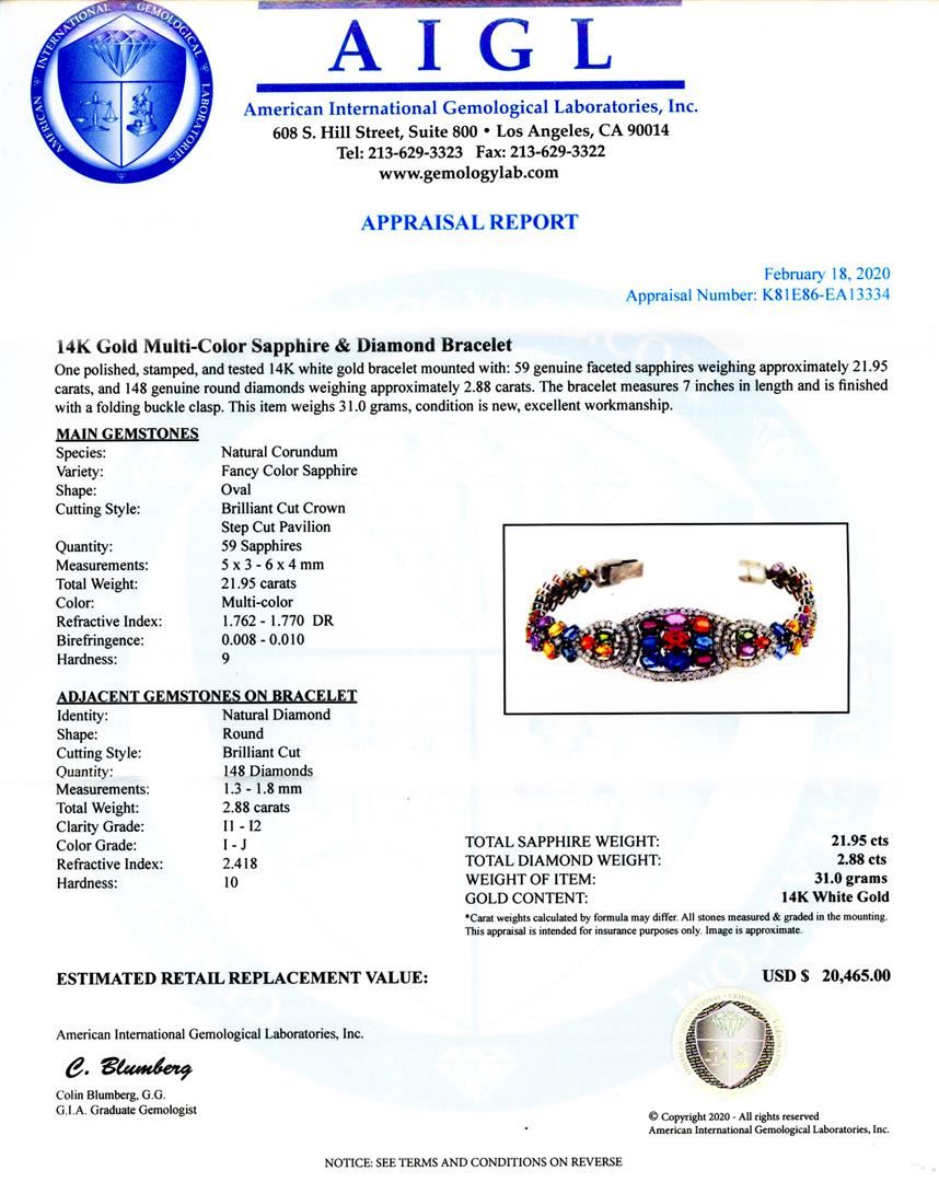 14K Gold Multi-Color Sapphire and Diamond Bracelet One polished, stamped, and tested 14K white gold bracelet mounted with: 59 genuine faceted sapphires weighing approximately 21.95 carats, and 148 genuine round diamonds weighing approximately 2.88 carats. The bracelet measures 7 inches in length and is finished with a folding buckle clasp. This item weighs 31.0 grams, condition is new, excellent workmanship. MAIN GEMSTONES Species: Natural Corundum Variety: Fancy Color Sapphire Shape: Oval Cutting Style: Brilliant Cut Crown Step Cut Pavilion Quantity: 59 Sapphires Measurements: 5 x 3 - 6 x 4 mm Total Weight: 21.95 carats Color: Multi-color Refractive Index: 1.762 - 1.770 DR Birefringence: 0.008 - 0.010 Hardness: 9 ADJACENT GEMSTONES ON BRACELET Identity: Natural Diamond Shape: Round Cutting Style: Brilliant Cut Quantity: 148 Diamonds Measurements: 1.3 - 1.8 mm Total Weight: 2.88 carats Clarity Grade: I-1 to I-2 Color Grade: I-J Refractive Index: 2.418 Hardness: 10 TOTAL SAPPHIRE WEIGHT: 21.95 cts TOTAL DIAMOND WEIGHT: 2.88 cts WEIGHT OF ITEM: 31.0 grams GOLD CONTENT: 14K White Gold