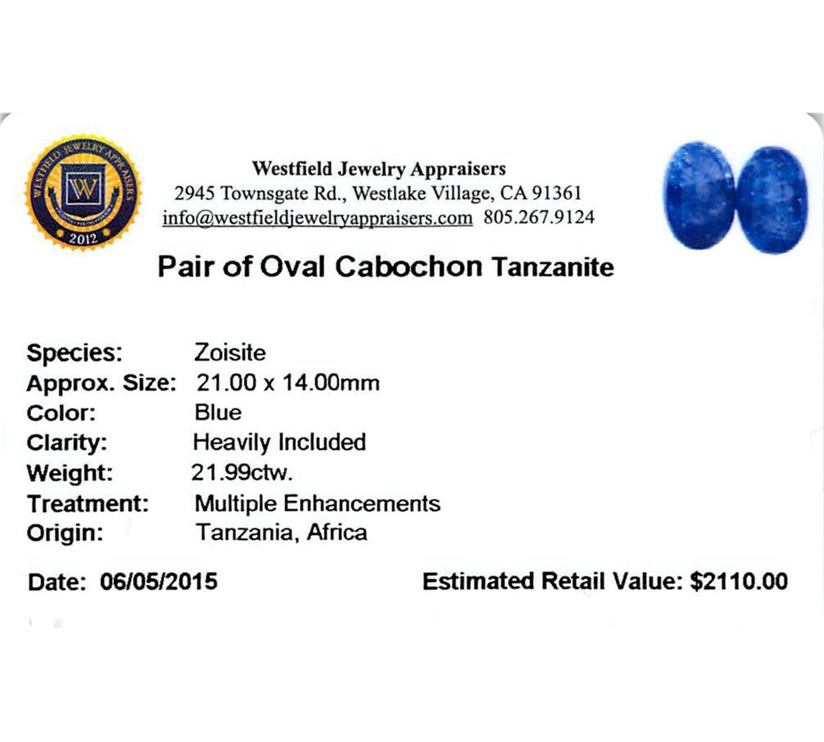 One oval cabochon cut natural tanzanite, measuring 21.00 x 14.00 x 8.00mm, exact weight 21.99ct., clarity is heavily included, type I, dark, very slightly grayish, blue color, (GIA B 7/3), cut is good. Transmitting light somewhat diffusely, transparent to translucent. Naturally occurring internal & external characteristics are present. Indications of heat treatment. Westfield Appraised at $2,110.00.