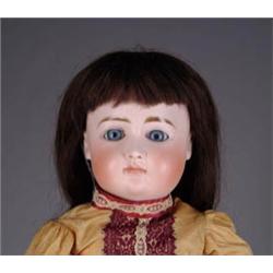 21” CLOSE MOUTH KESTNER. A fine example of a close mouth Kestner on the fat early chunky composition body with straight wrists. She has pale blue gray eyes (set) and creamy bisque. Wearing antique clothing and a replacement brown human hair wig. CONDITION: Hairline out of neck socket, but not extending to facial features, and certainly a nice and affordable doll for a collector. JL 1-2597