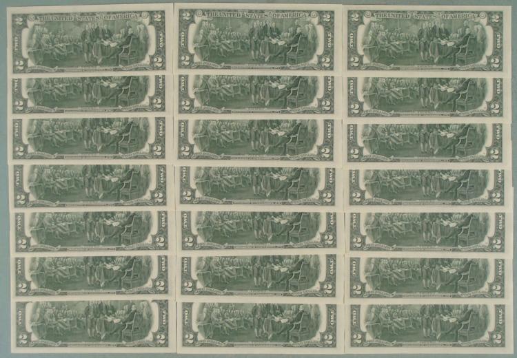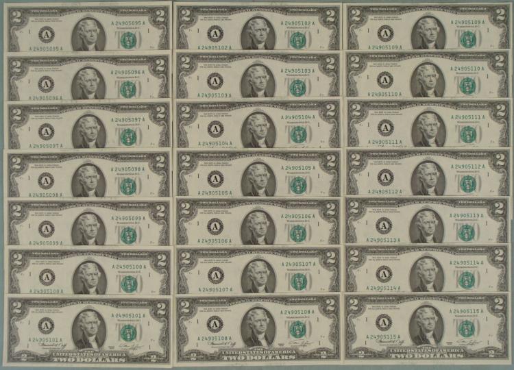 (21) 1976 $2 Two Dollar Notes with sequential serial numbersMint mark: A (Boston)Condition: Crisp Uncirculated