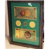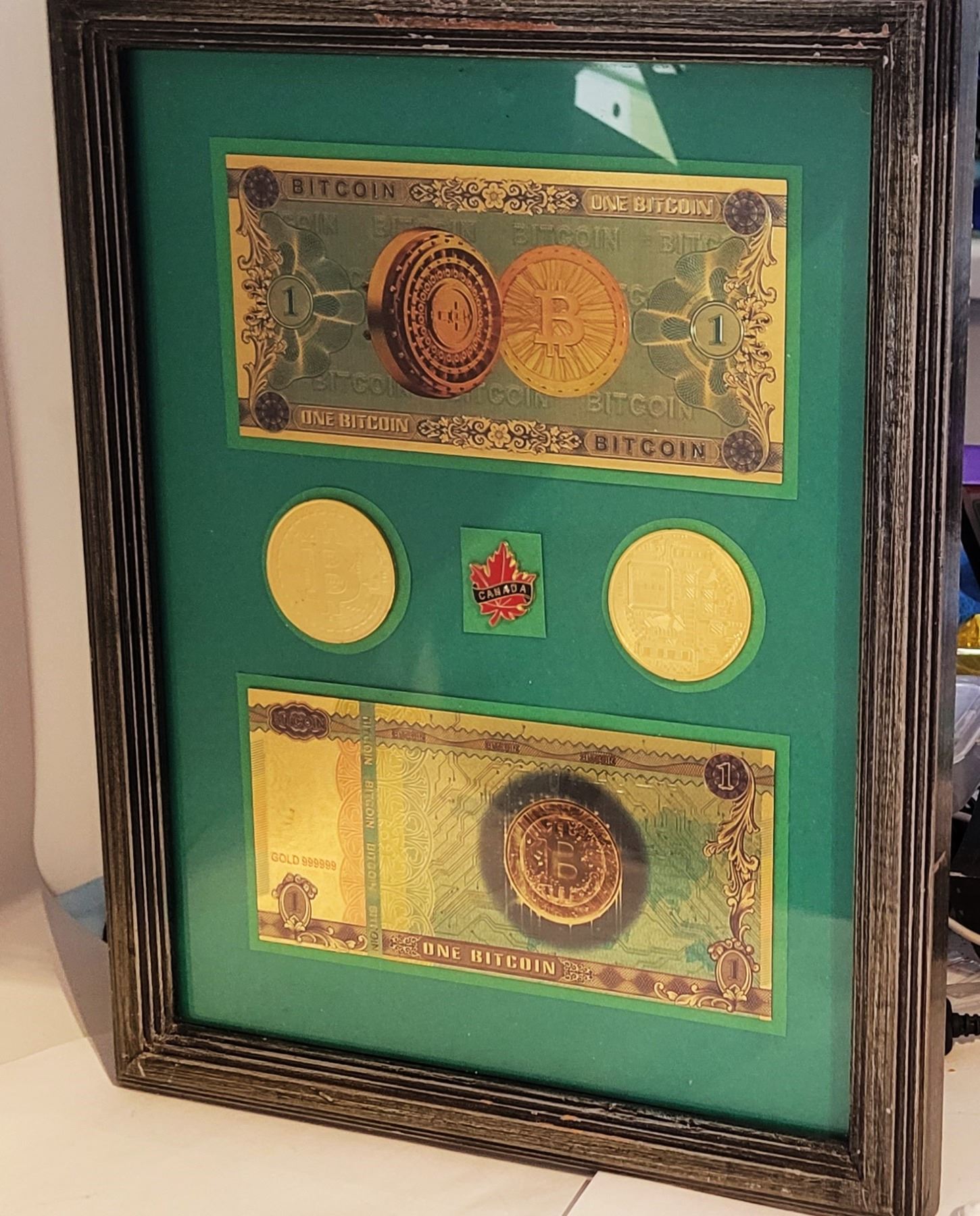 21) FRAMED UNDER GLASS 2 GOLD TONE BITCOINS,