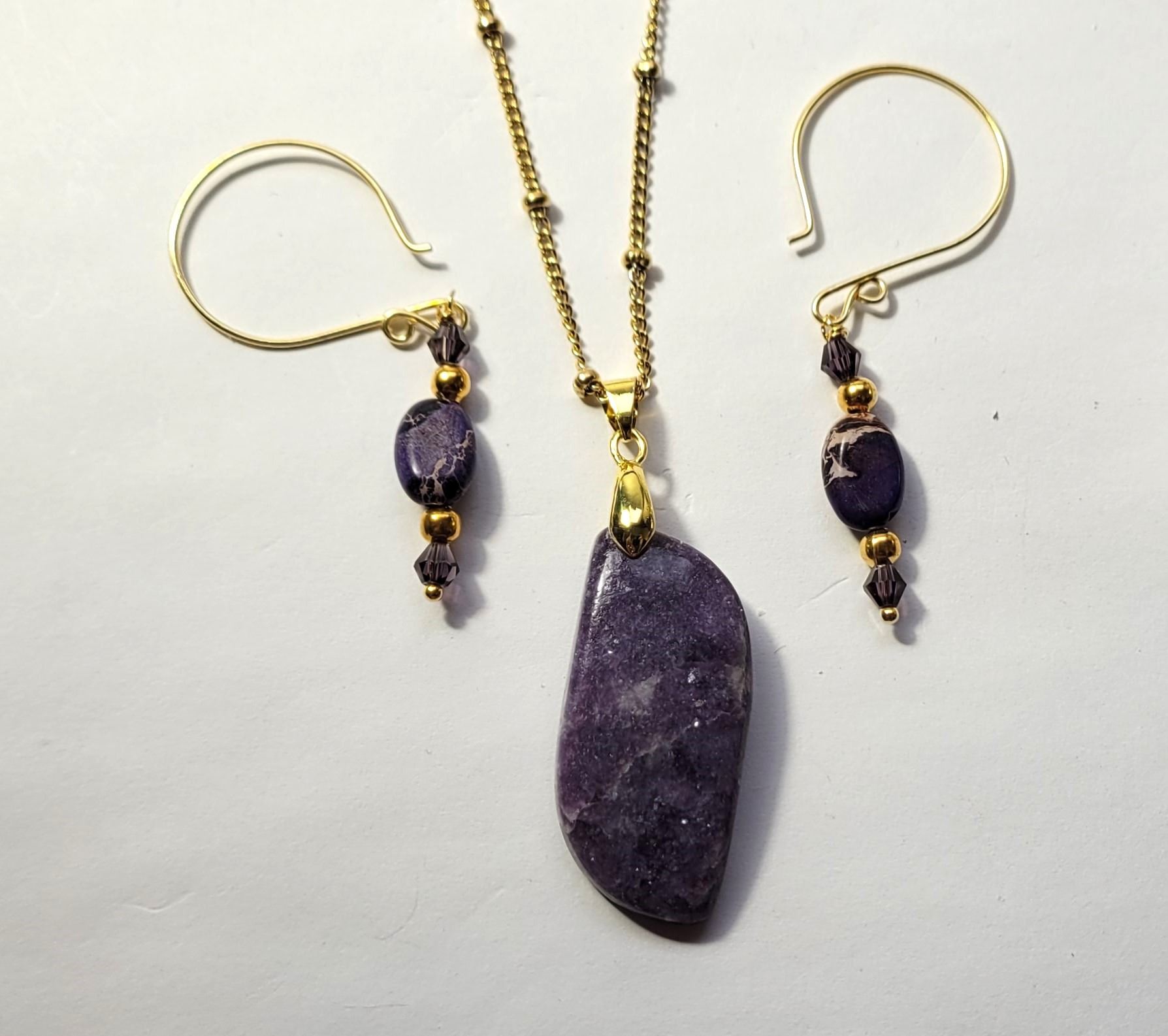37.5 CT PURPLE LEPIDOLITE PENDANT AND MATCHING DROP EARRINGS. JEWELERY