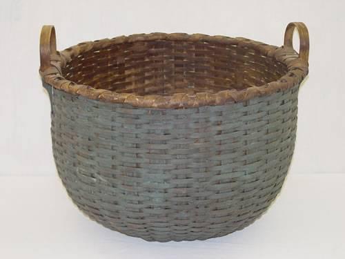 21" GREEN PAINTED DOUBLE HANDLED ORCHARD BASKET - SOME PAINT WEAR;