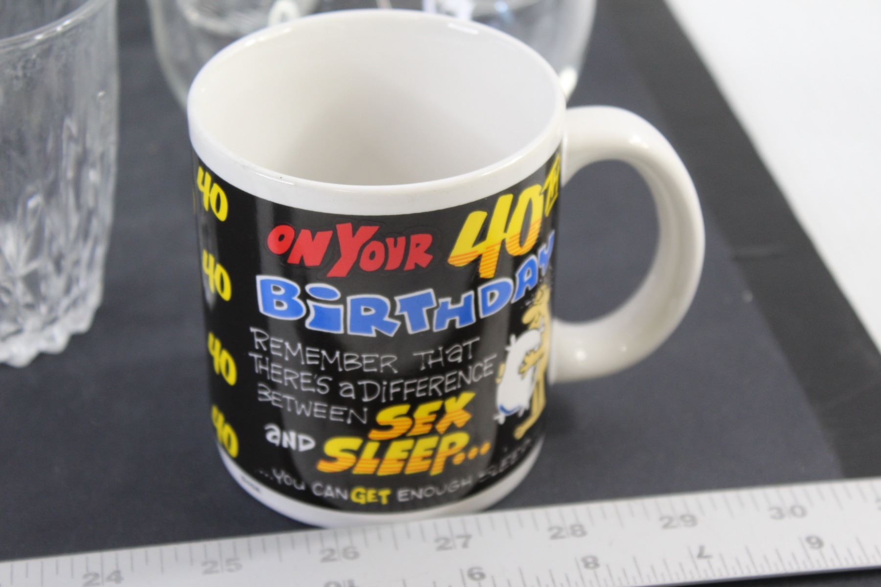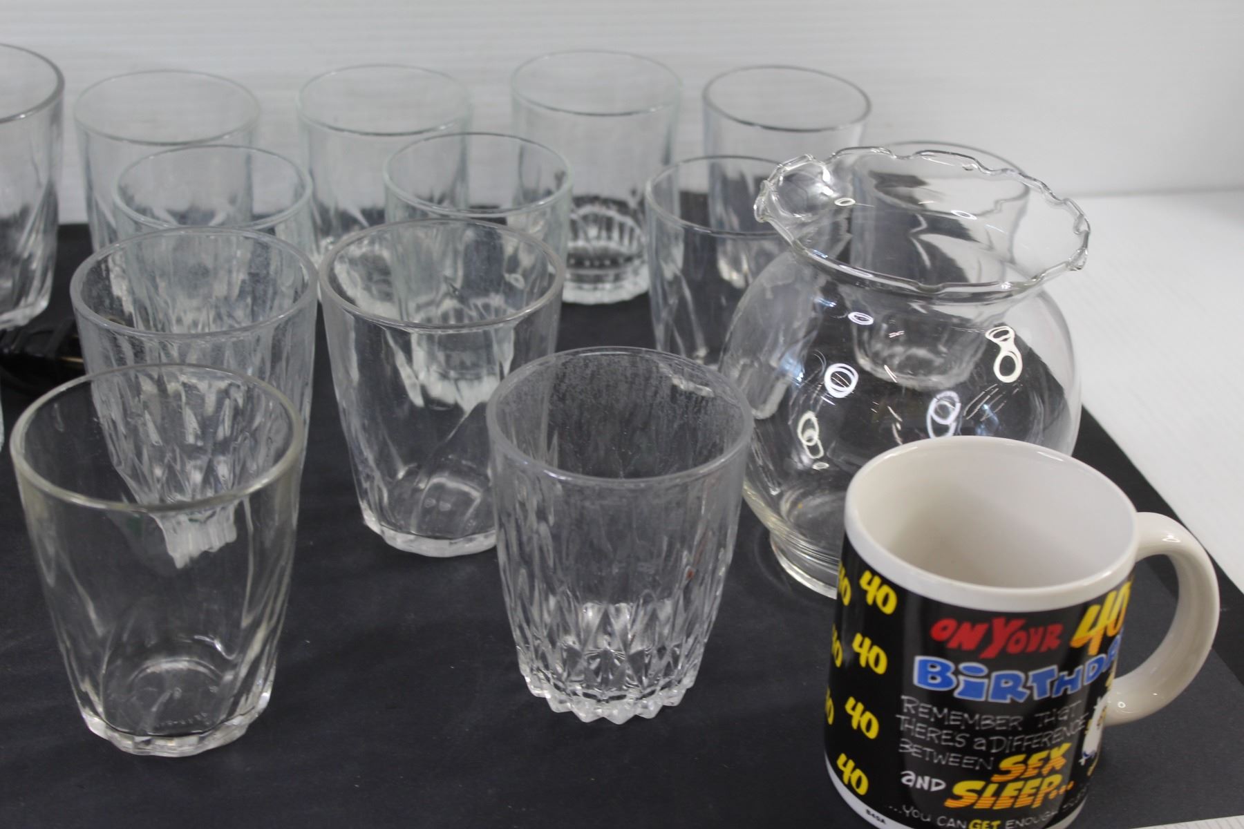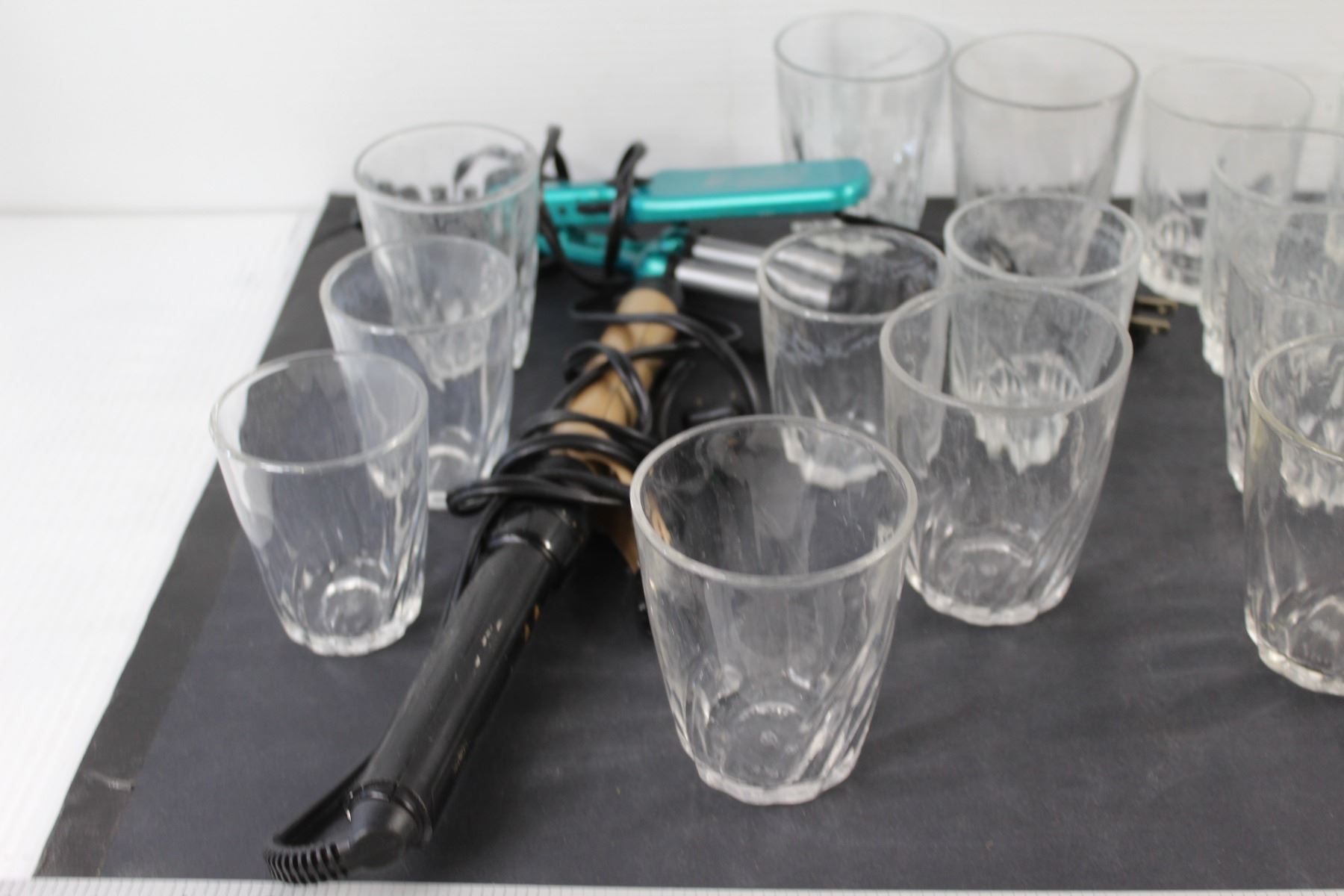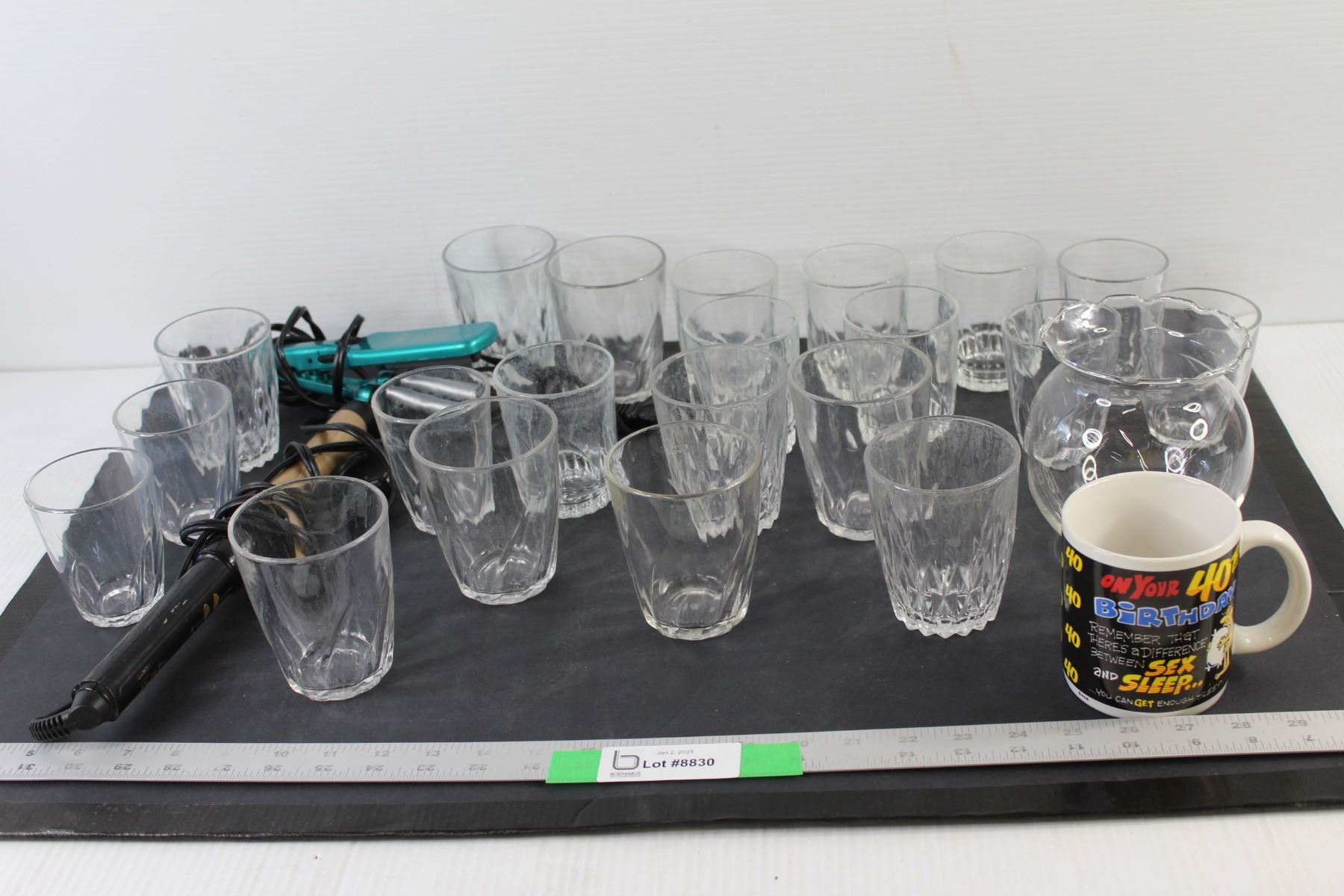 (21) Glass Cups, 40th Birthday Mug, (2) Curling irons - As Is, Vase