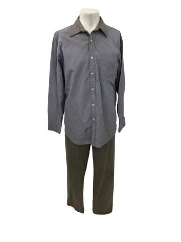 Paul Rivers (Sean Penn) screen worn light blue, distressed dress shirt (J Crew) (M) and khaki green pants (Banana Republic) (30x30). Includes original production wardrobe tag with scene numbers the costume was worn in.