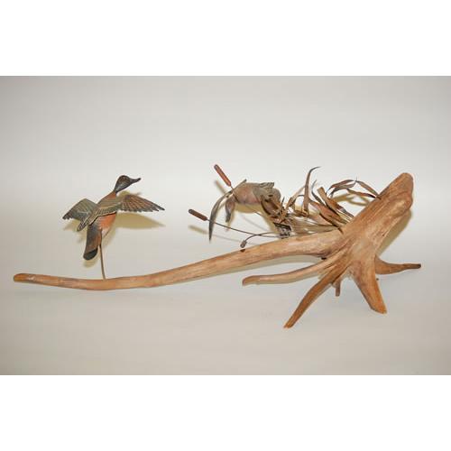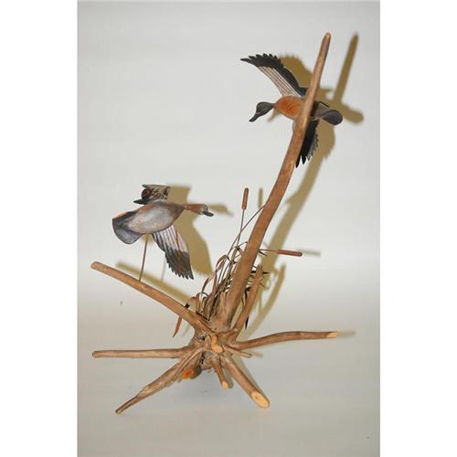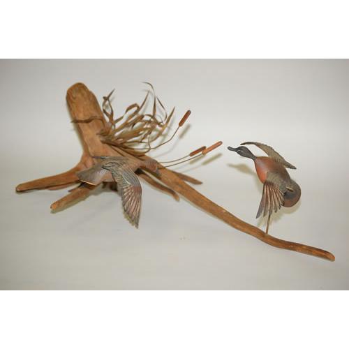 21" H.J. WHITE MINIATURE BIRD CARVING GROUP - MINIATURE CARVED & PAINTED WOODEN DUCK CARVINGS IN FLIGHT W/ TIN WATER PLANTS & WIRE MOUNTINGS-SIGNED ON NATURAL WOOD BASE - WEAR, BREAKS, REPAIRS, LOSSES