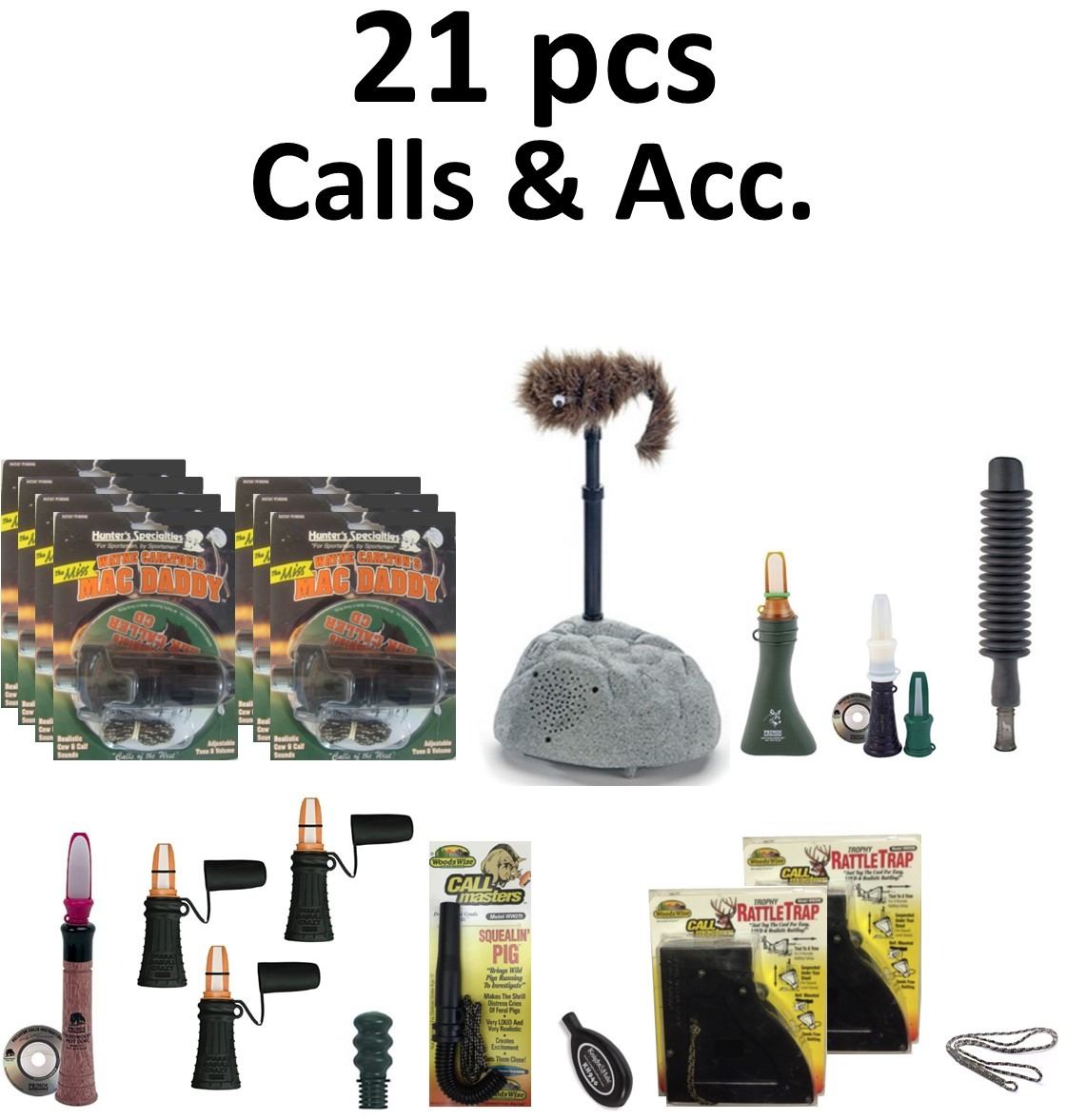 21 Hunting Call Products - Mini Mag Howler(1), Lil Dog Cal w/Instructural CD(1), Dog Catcher Sounds Like a Coyote Skaing a Rabbit(1), Hardwood Hot Dog(1), Single Lanyard(1), Imaka Da Bullcrazy(3), The Miss Mac Daddy Cow Call (7), EZY Mouser(1), Trophy Rattle Trap(2), Squealin Pig(1), Predator - Mouse Squeaker(1), The All Call(1)