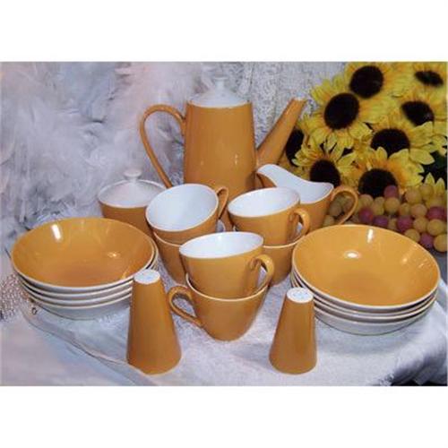* set includes 21 pieces: 1 coffee pot with lid, 1 creamer, 1 sugar with lid, 6 coffee cups, 8 cereal bowls, 1 salt shaker, 1 pepper shaker