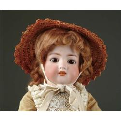 21” S&H 540 DOLL. Head incised “540 GERMANY,” “HALBIG S&H,” with brown glass sleep eyes, open mouth with four teeth, on fully articulated wood and composition body stamped “HEINRICH HANDWERCK GERMANY.” Redressed in a pleated gold dress with white lace decoration, strawberry blonde mohair wig, brown leather shoes, and straw hat. CONDITION: Tiny white spot in center of right cheek; body in overall good condition with original finish. RS 1-3511 (250-350)