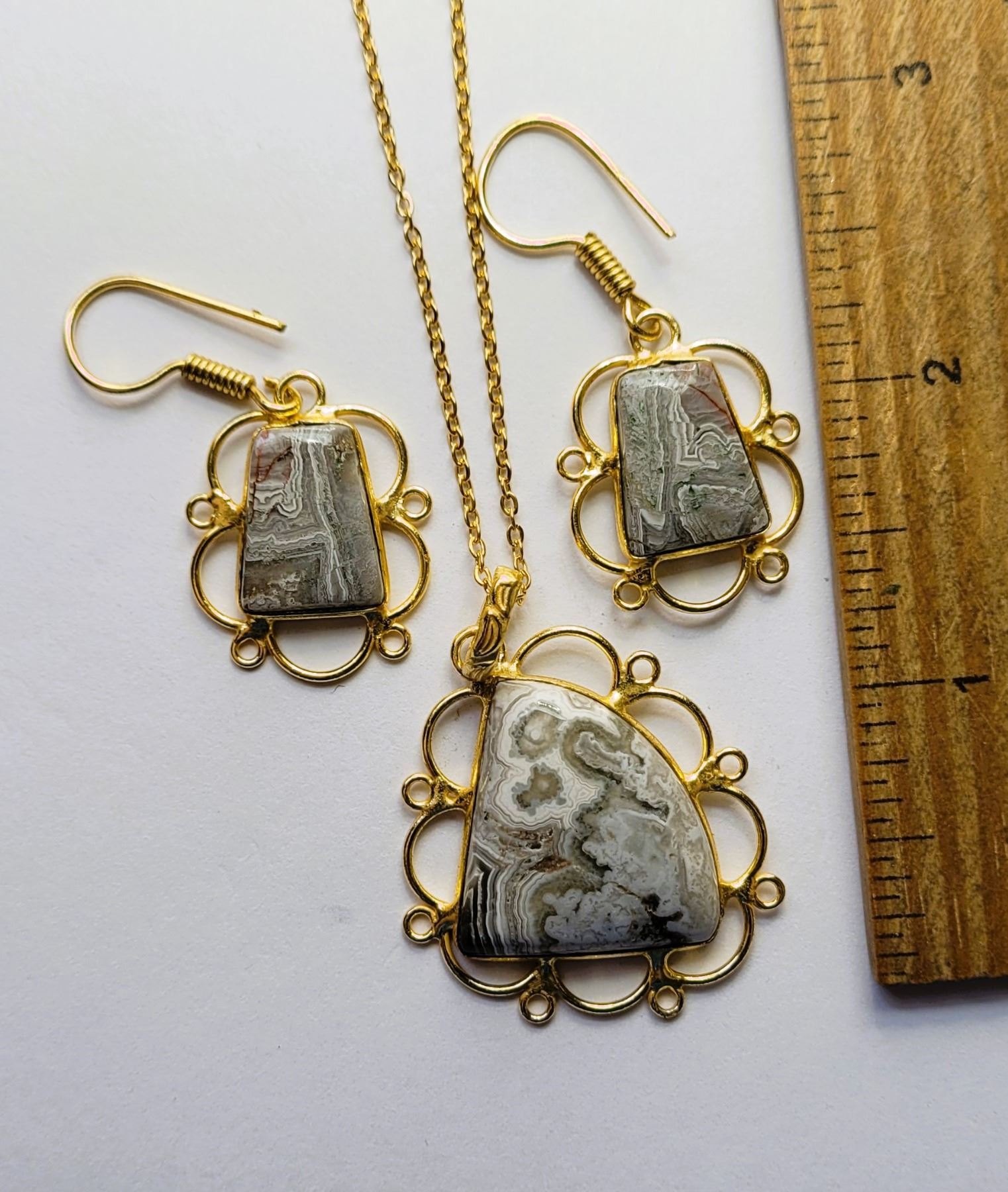 LACE AGATE DROP EARRINGS AND PENDANT ON 18" CHAIN. JEWELRY