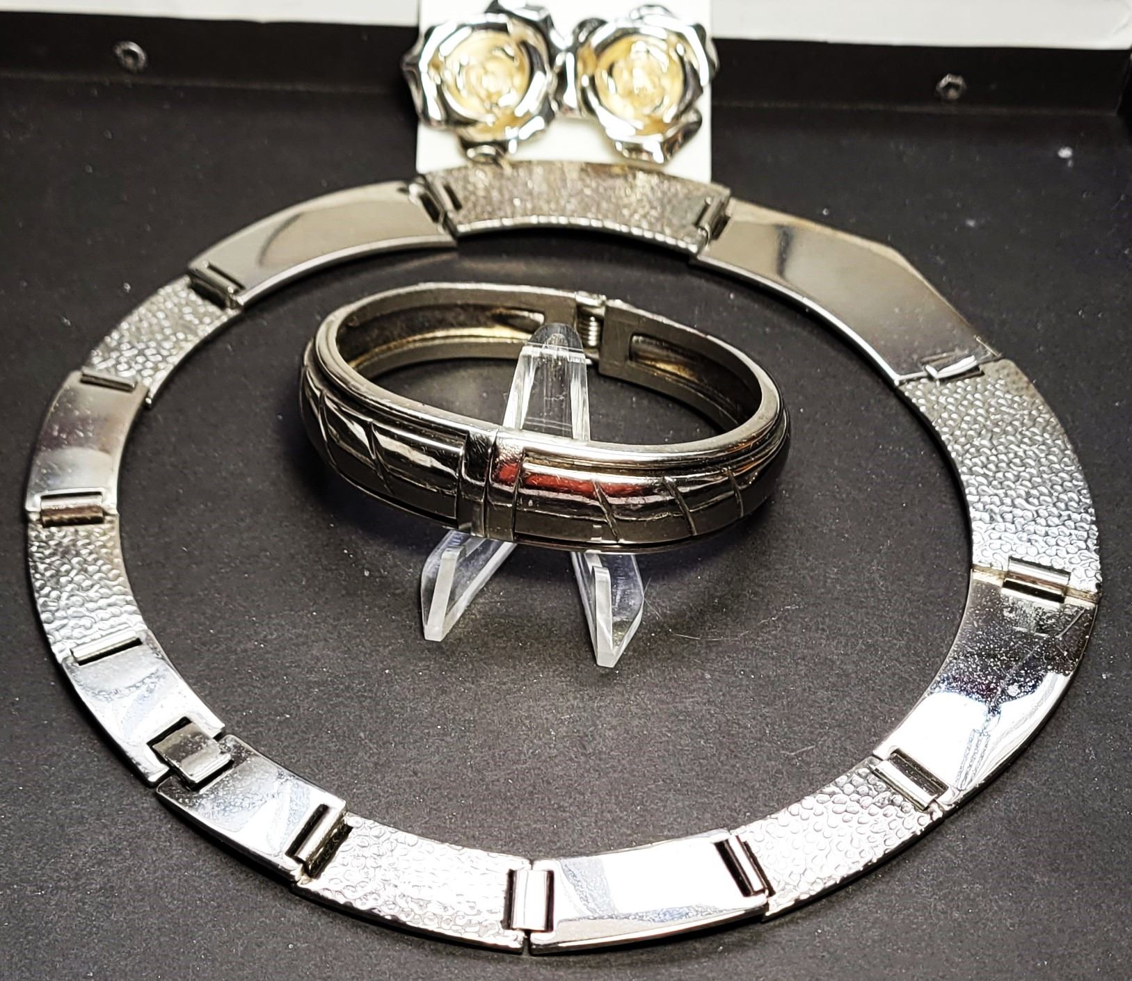 EARRINGS, HINGED BRACELET AND SHINEY & BEATEN SILVER EFFECT COLLAR NECKLACE