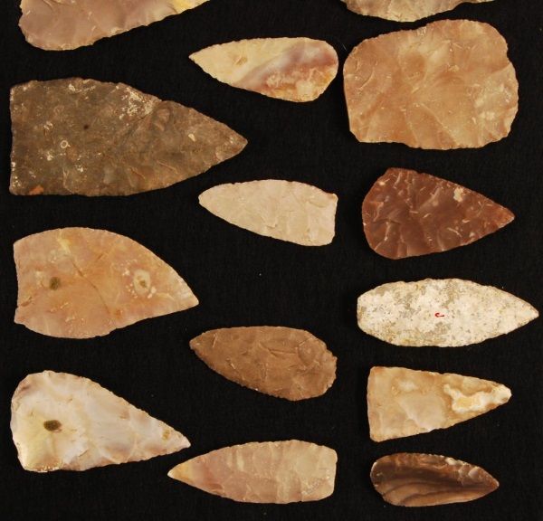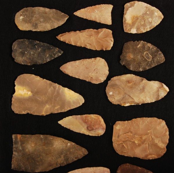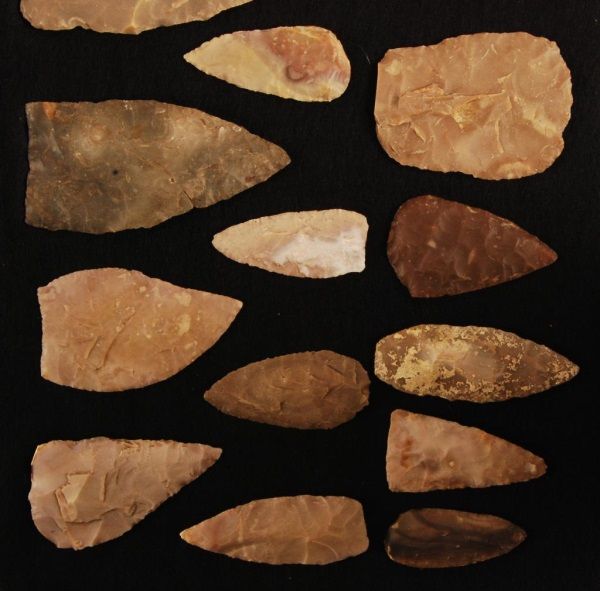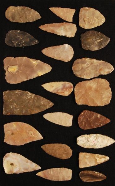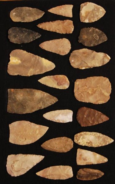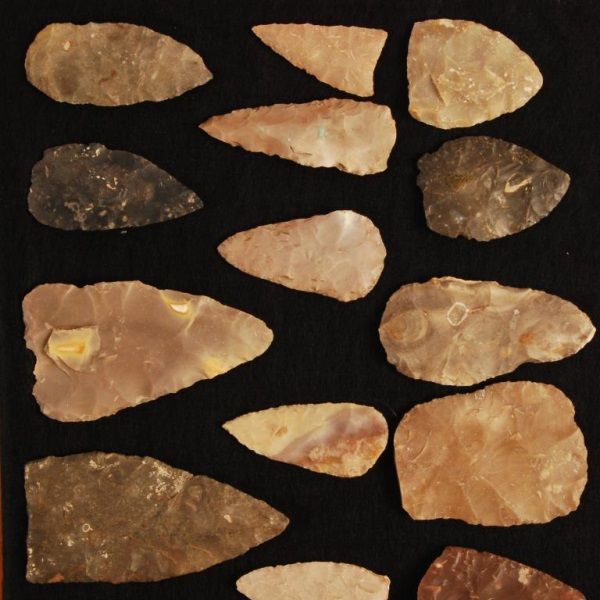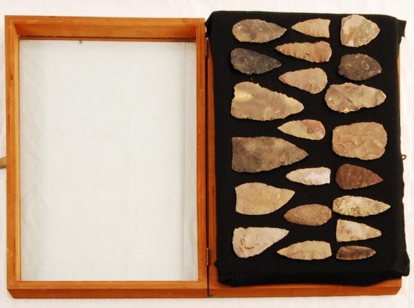 In dispaly case, 24" tall, 16" wide, 2 1/2" deep. Largest blade measures 6".