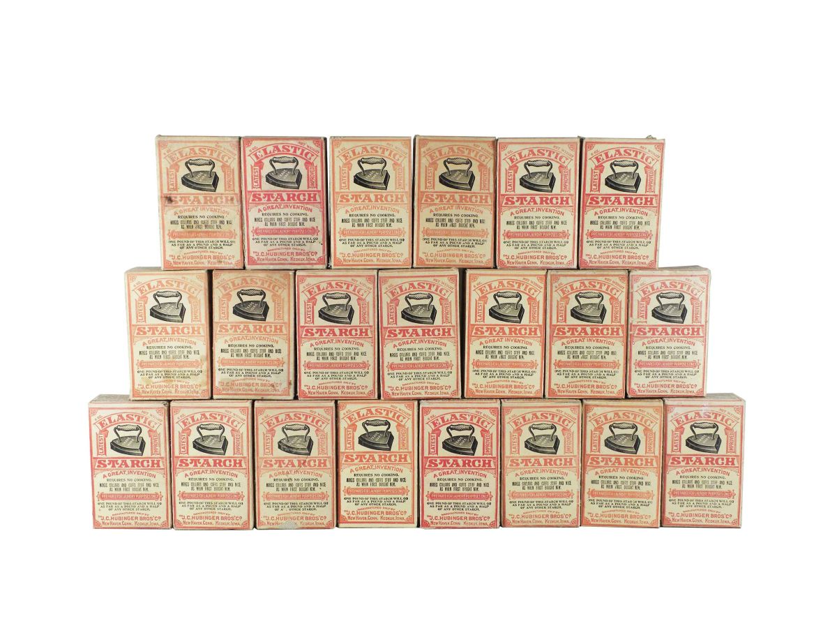 Lot of 21 Unopened Boxes of Elastic Starch, "A great invention". The J.C. Hubinger Bros' Co. New Haven, Conn. & Keokuk, Iowa. Each box measures 2 3/4 X 4 1/2 X 1 1/4 inches.