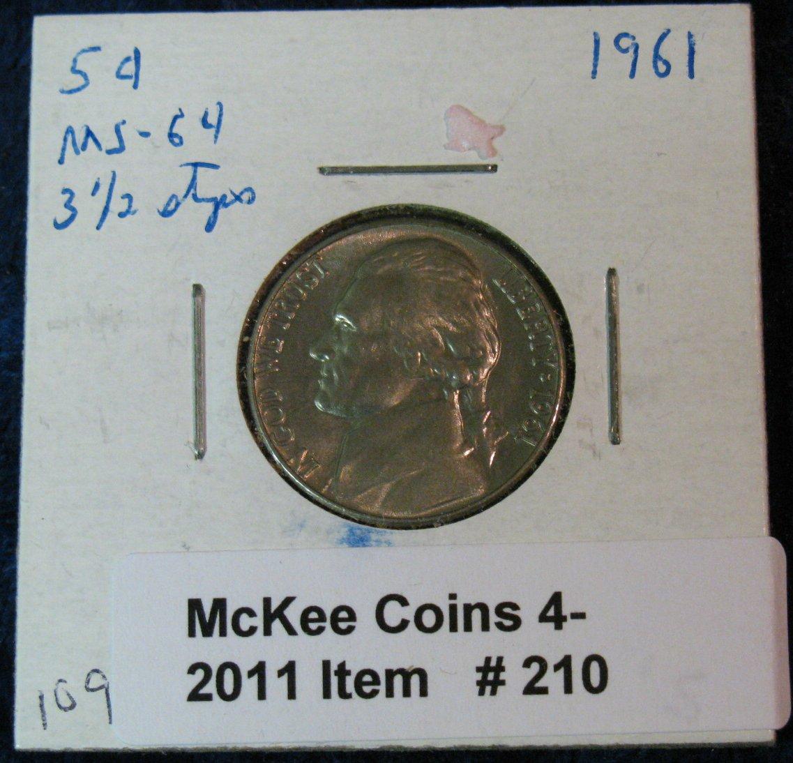 210. 1961 P Jefferson Nickel. MS 64. 3 1/2 steps.