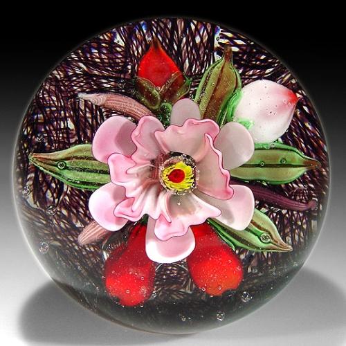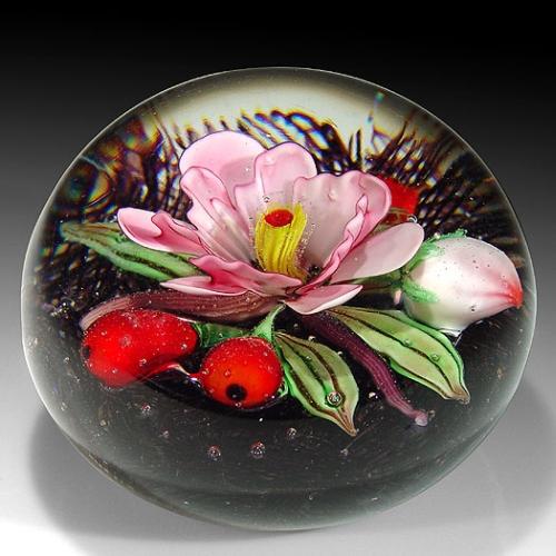Chinese red pears and blossom paperweight, with a large, upright, pale pink blossom, bud, two red pears, and green leaves, on a brown branch, over black upset muslin. Diameter 3 7/8". NO RESERVE