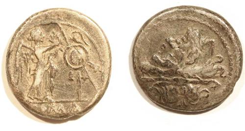 Victoriatus c 211-155BC, Laureate head of Jupiter. Reverse; Victory standing right crowning trophy #S49.