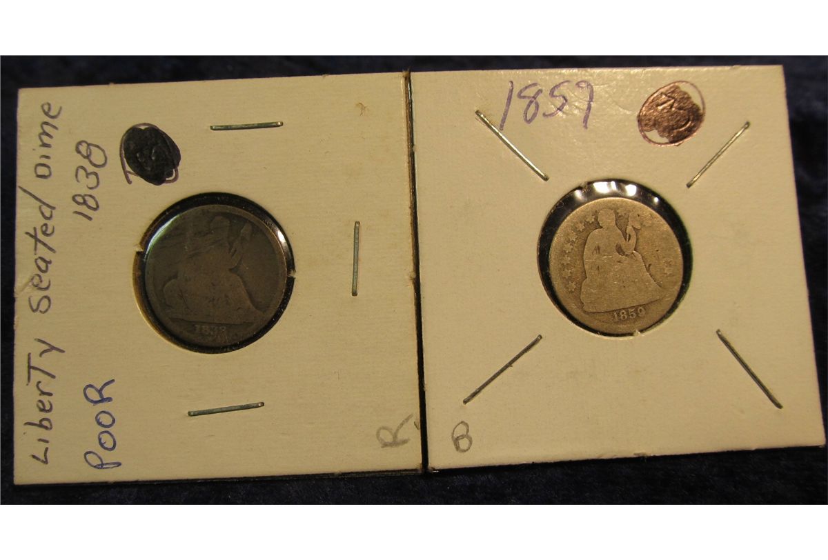 211. 1838 & 1859 U.S. Seated Liberty Dimes. AG-3. Redbook value in G-4 is $50.00.