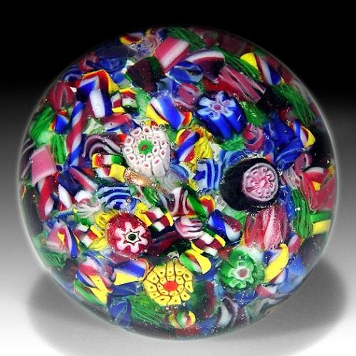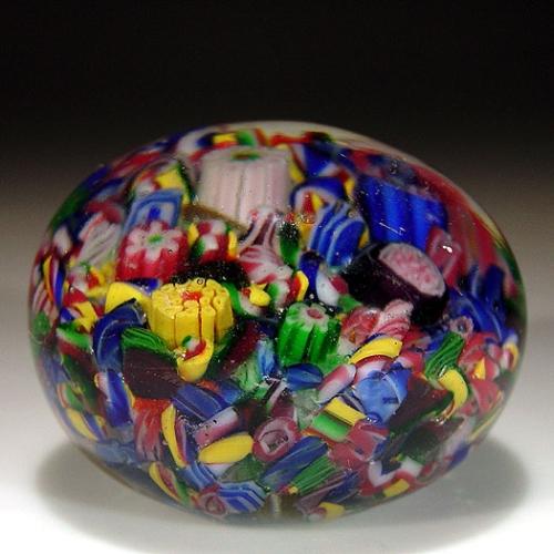 Chinese scrambled millefiori paperweight, composed of whole and partial canes, twists, rods, and latticinio. Diameter 2 1/4". NO RESERVE