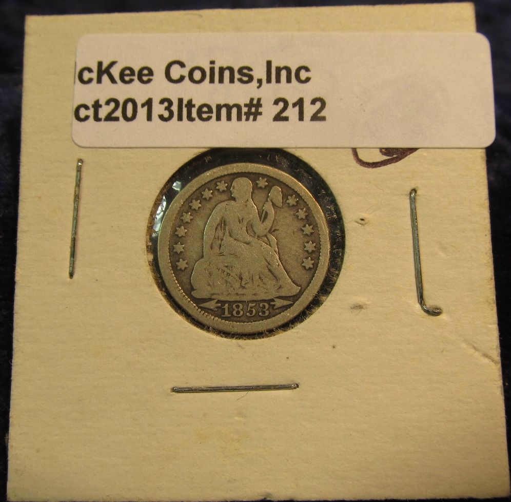 212. 1853 P With Arrows U.S. Seated Liberty Dime. VG-8.