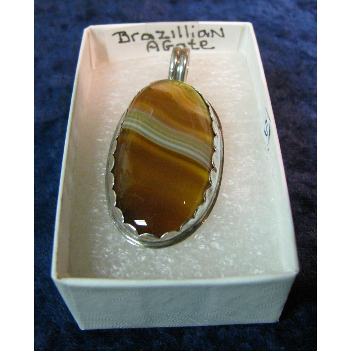 212. Brazillian Agate Banded Oval Sterling Silver Mount. New in box. Reverse signed by maker.