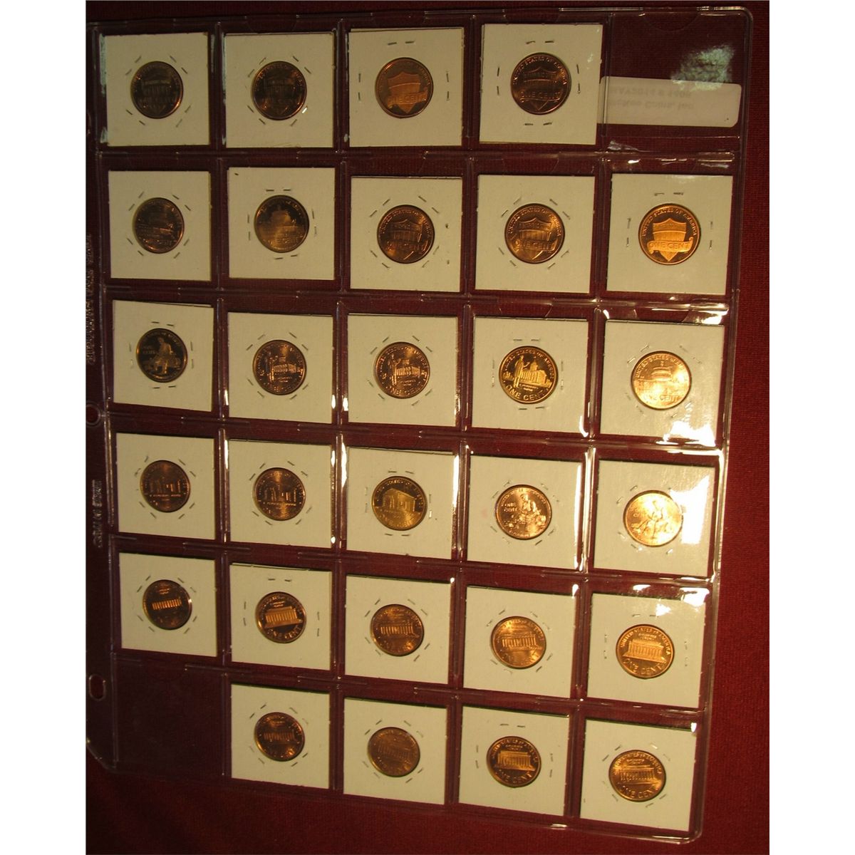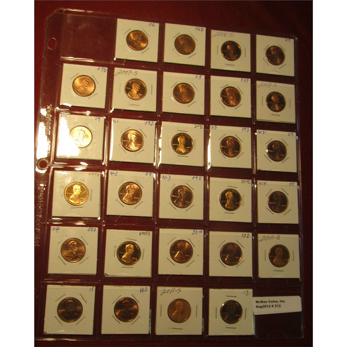 212. Plastic Stock page containing (28) Lincoln Cents in 1 1/2" x 1 1/2" holders. Includes Proofs & Gem BU dating from 2006 S up to 2012. No 2012 S Proof however.