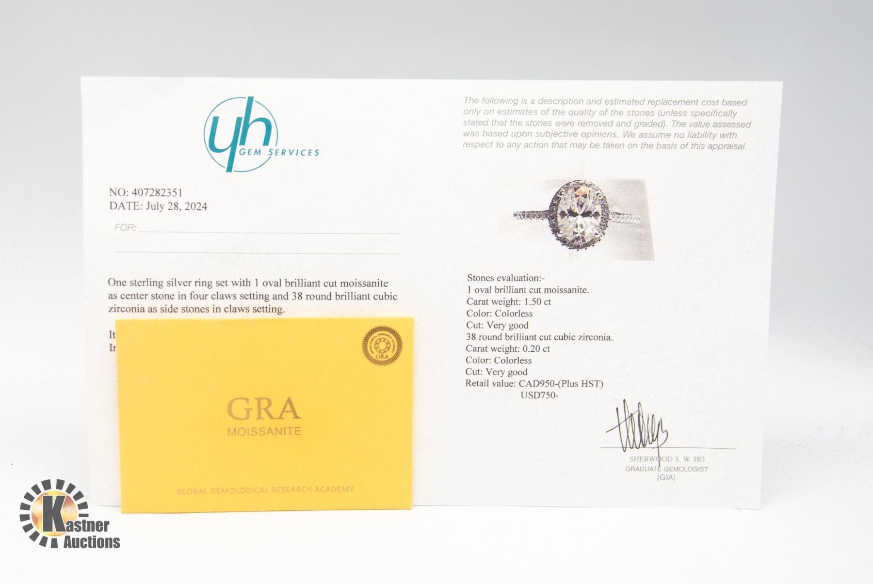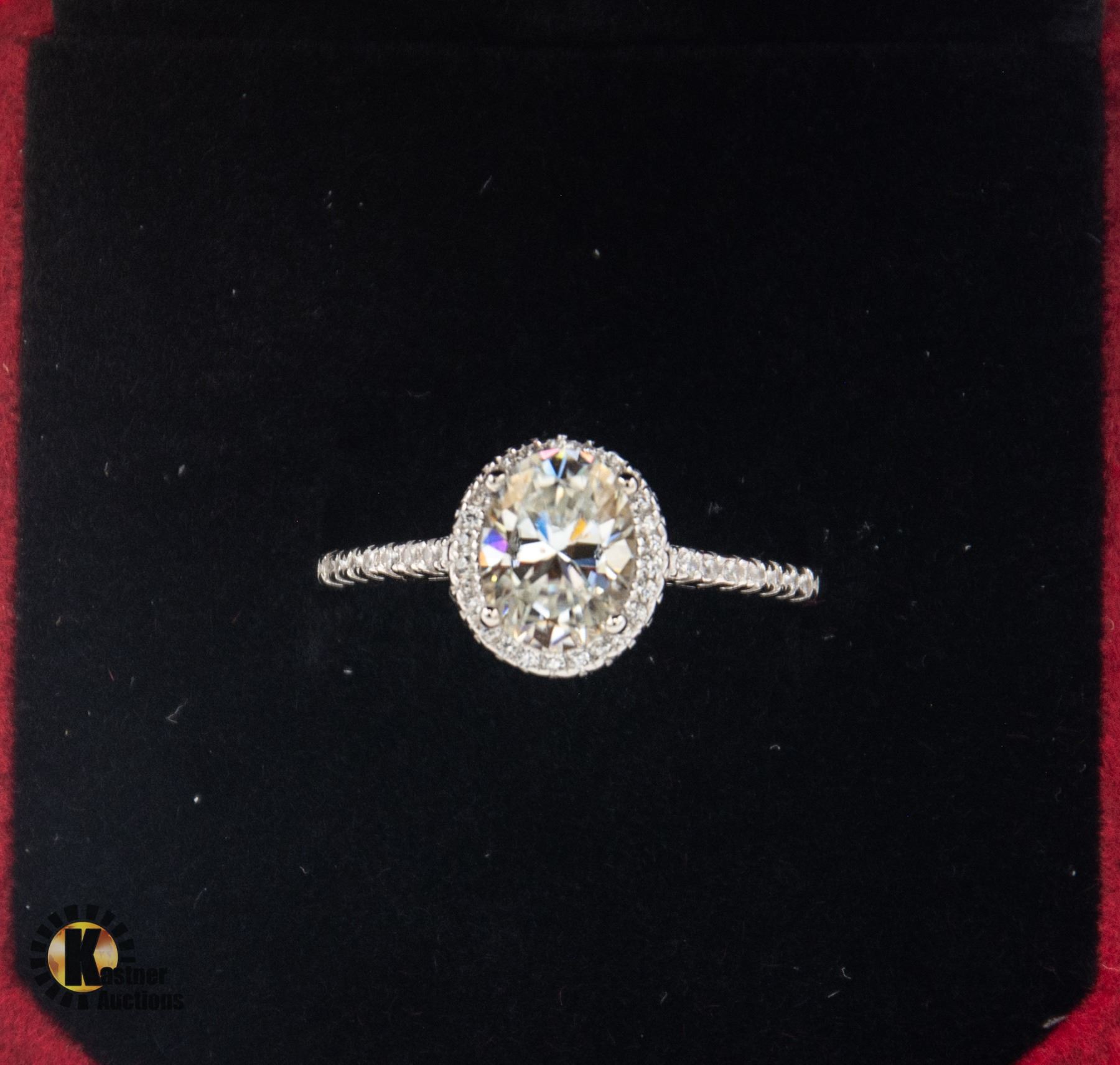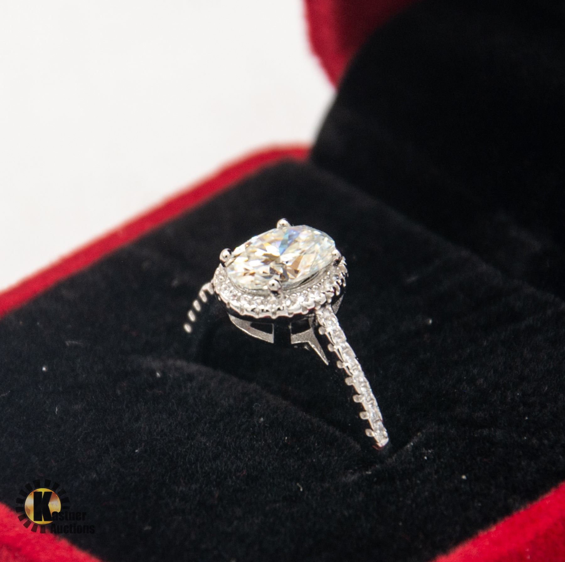 MOISSANITE STONE VVS D COLOR WITH 38 ROUND BRILLIANT CUT CUBIC ZIRCONIA SET IN OVAL HALO WITH MORE SET IN SHANKS SET IN 925 SILVER RING SIZE 7 RETAIL VALUE $950.00 **ALL ITEMS MUST BE REMOVED BY 5PM SATURDAY, FEBRUARY 8TH 2025. ALL REMAINING ITEMS WILL BE SUBJECT TO A $6.00 PER DAY STORAGE CHARGE. ANY ITEMS REMAINING AFTER MONDAY, MARCH 3RD 2025 WILL BE CONSIDERED FORFEITED. NO REFUNDS WILL BE ISSUED FOR FORFEITED ITEMS. TO SCHEDULE A PICK UP APPOINTMENT CLICK HERE