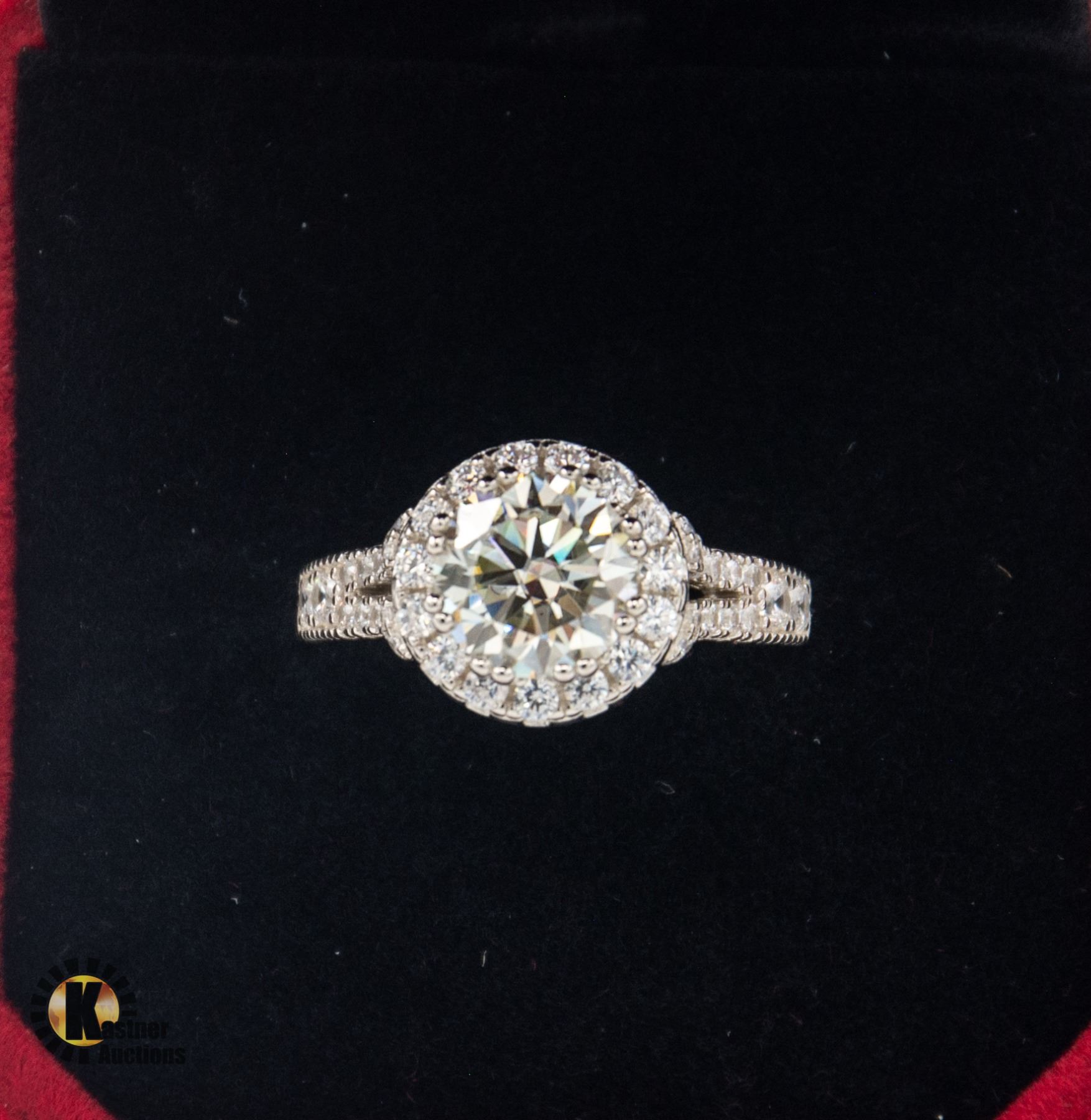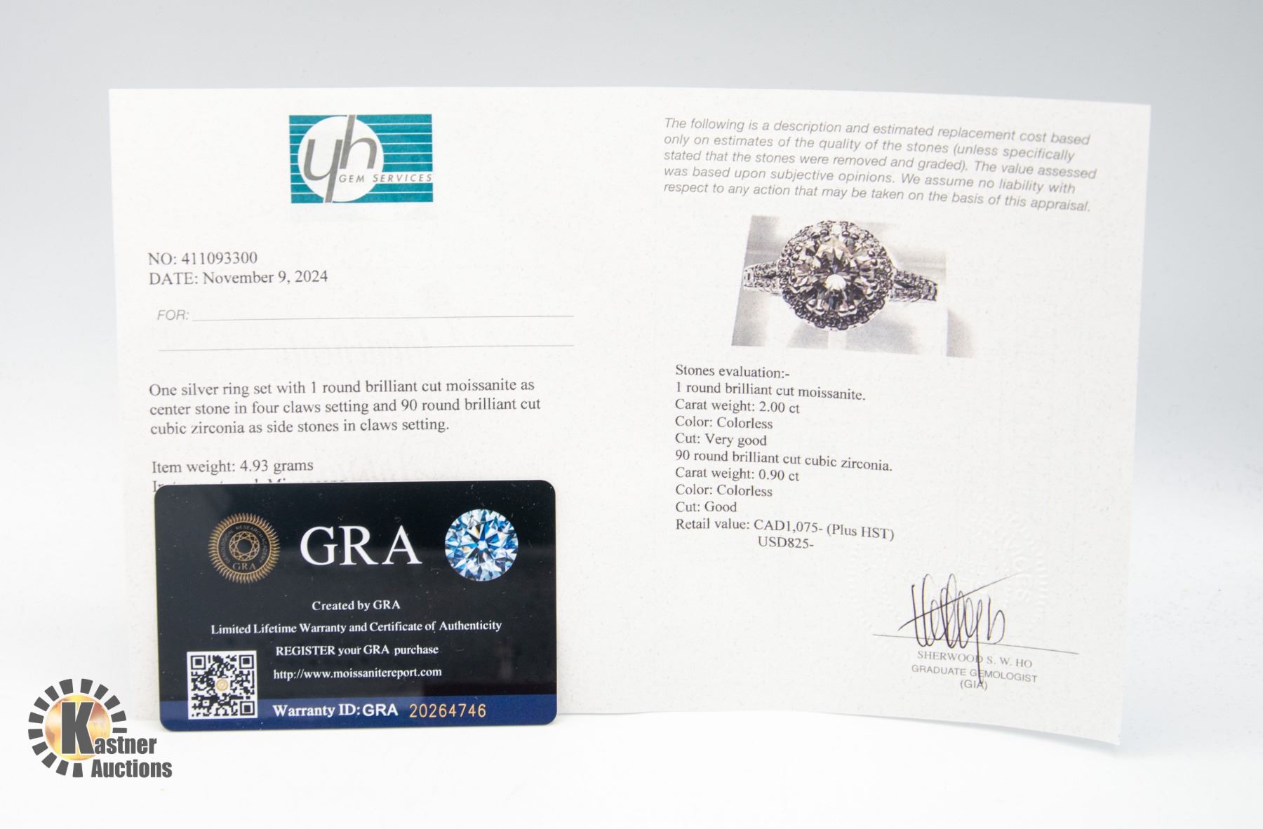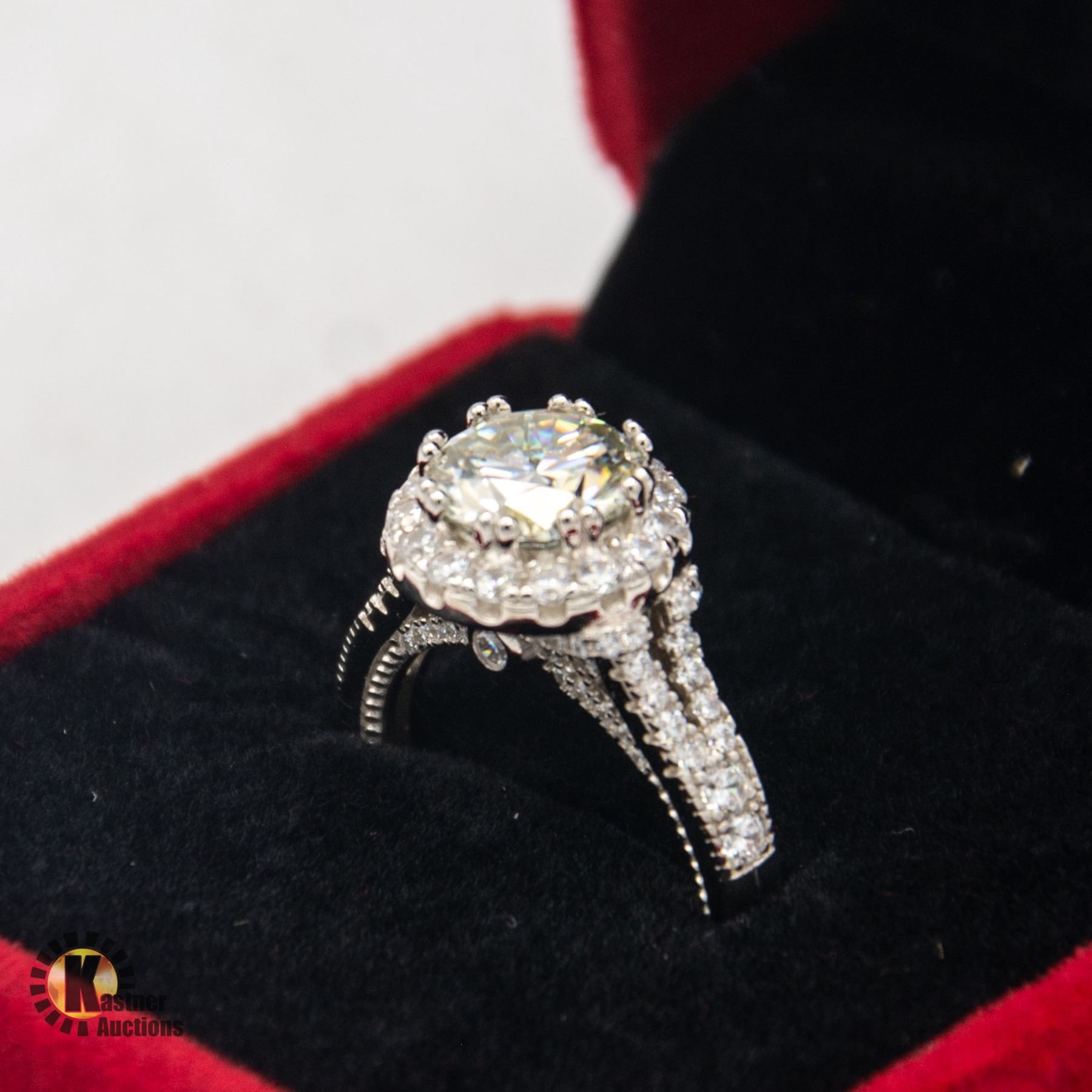 MOISSANITE STONE VVS D COLOR WITH 90 ROUND BRILLIANT CUT CUBIC ZIRCONIA SET IN ROUND HALO WITH MORE SET THROUGHOUT THE RING SET IN 925 SILVER RING SIZE 6 RETAIL VALUE $1,075.00 **ALL ITEMS MUST BE REMOVED BY 5PM SATURDAY, FEBRUARY 8TH 2025. ALL REMAINING ITEMS WILL BE SUBJECT TO A $6.00 PER DAY STORAGE CHARGE. ANY ITEMS REMAINING AFTER MONDAY, MARCH 3RD 2025 WILL BE CONSIDERED FORFEITED. NO REFUNDS WILL BE ISSUED FOR FORFEITED ITEMS. TO SCHEDULE A PICK UP APPOINTMENT CLICK HERE