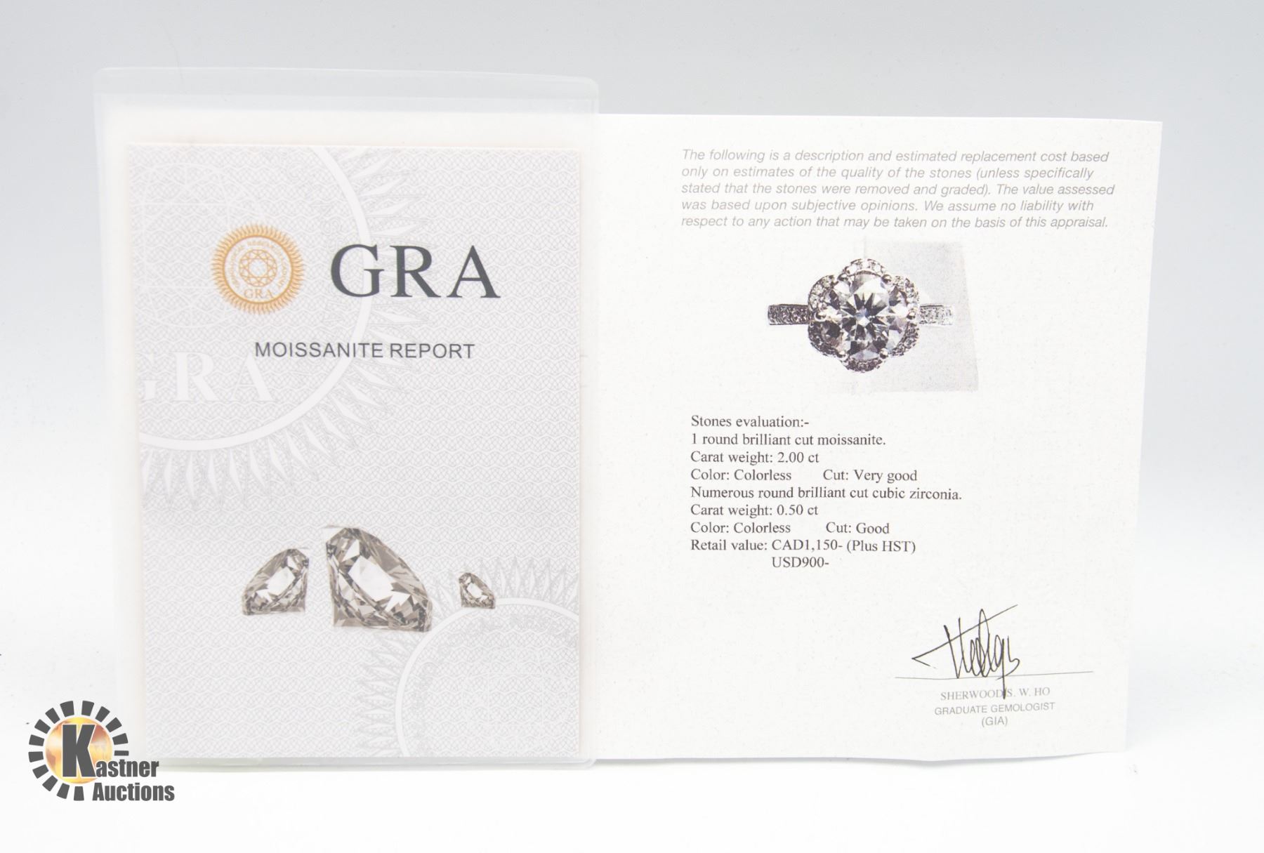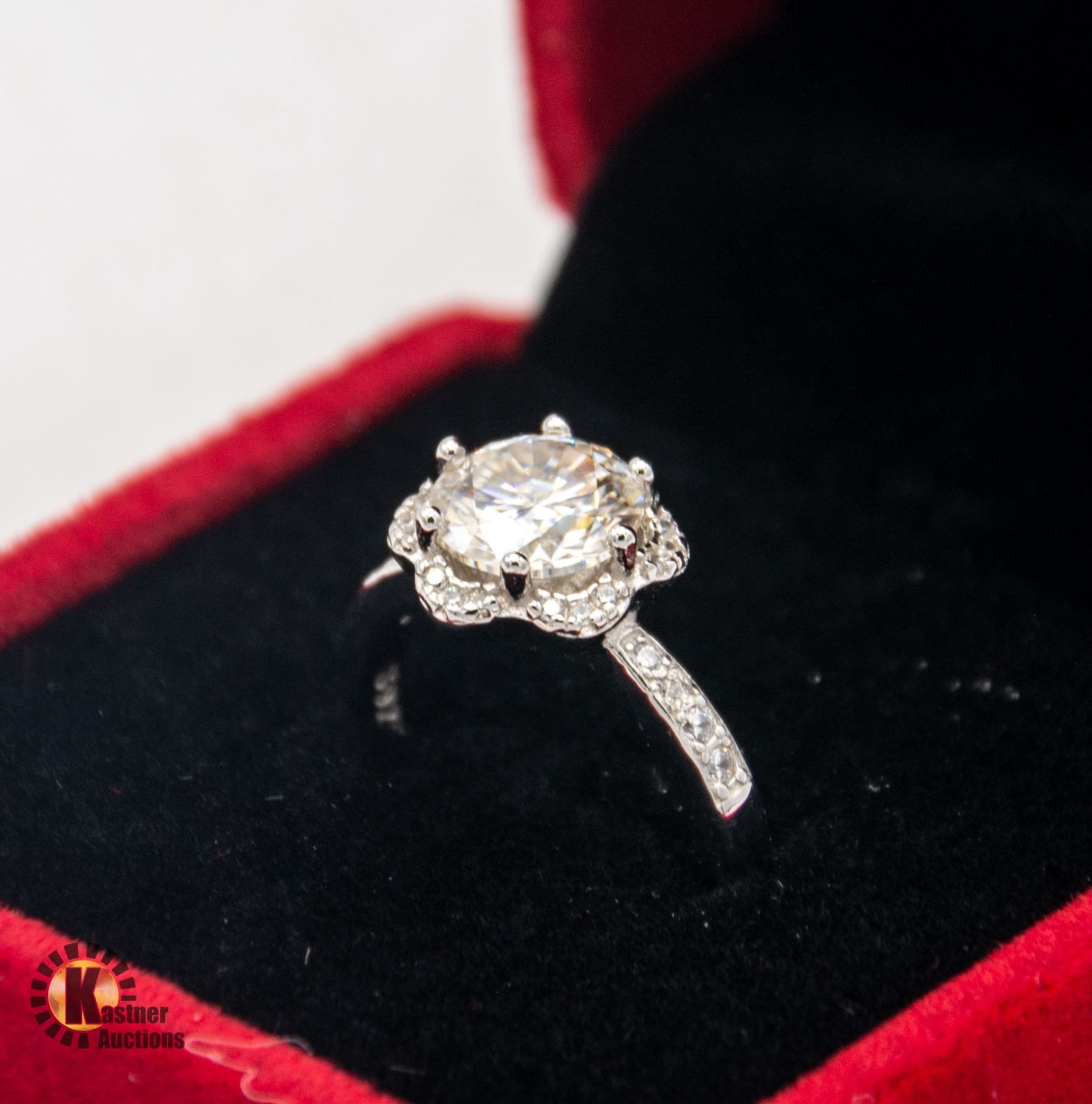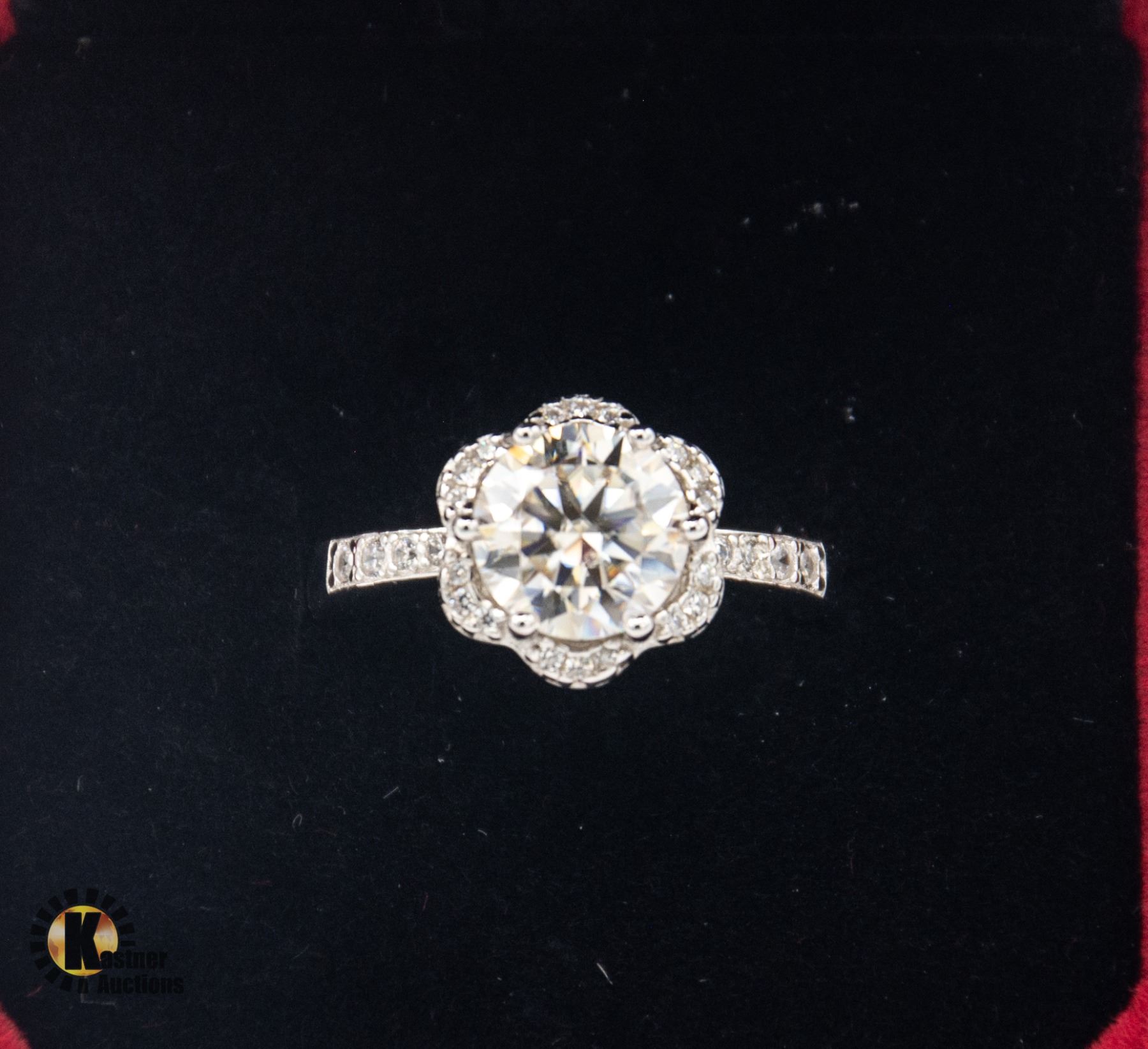 MOISSANITE STONE VVS D COLOR WITH NUMEROUS ROUND BRILLIANT CUT CUBIC ZIRCONIA SET IN ROUND FLORAL HALO SET WITH MORE SET IN SHANKS SET IN 925 SILVER RING SIZE ADJUSTABLE RETAIL VALUE $1,150.00 **ALL ITEMS MUST BE REMOVED BY 5PM SATURDAY, FEBRUARY 8TH 2025. ALL REMAINING ITEMS WILL BE SUBJECT TO A $6.00 PER DAY STORAGE CHARGE. ANY ITEMS REMAINING AFTER MONDAY, MARCH 3RD 2025 WILL BE CONSIDERED FORFEITED. NO REFUNDS WILL BE ISSUED FOR FORFEITED ITEMS. TO SCHEDULE A PICK UP APPOINTMENT CLICK HERE