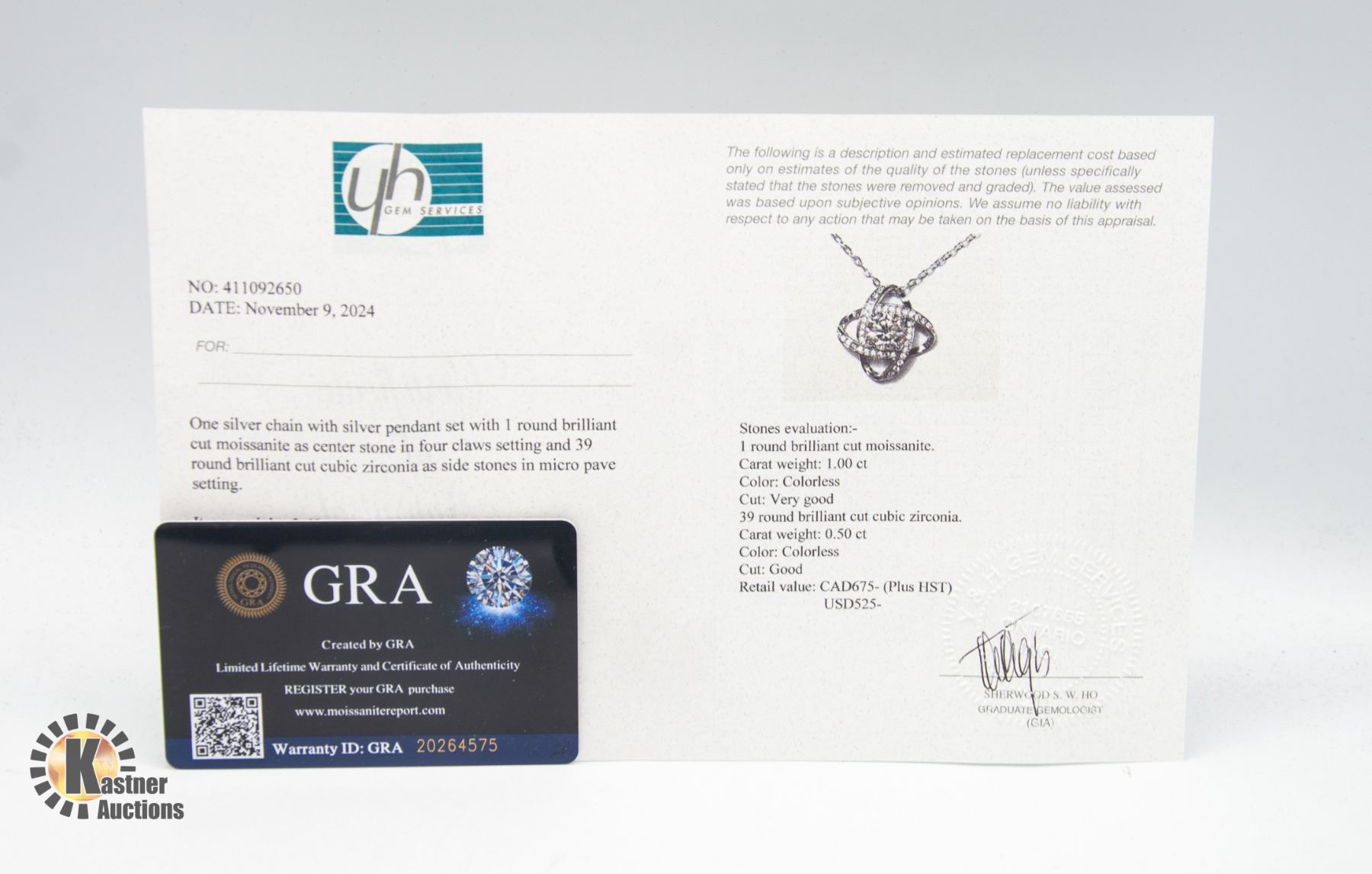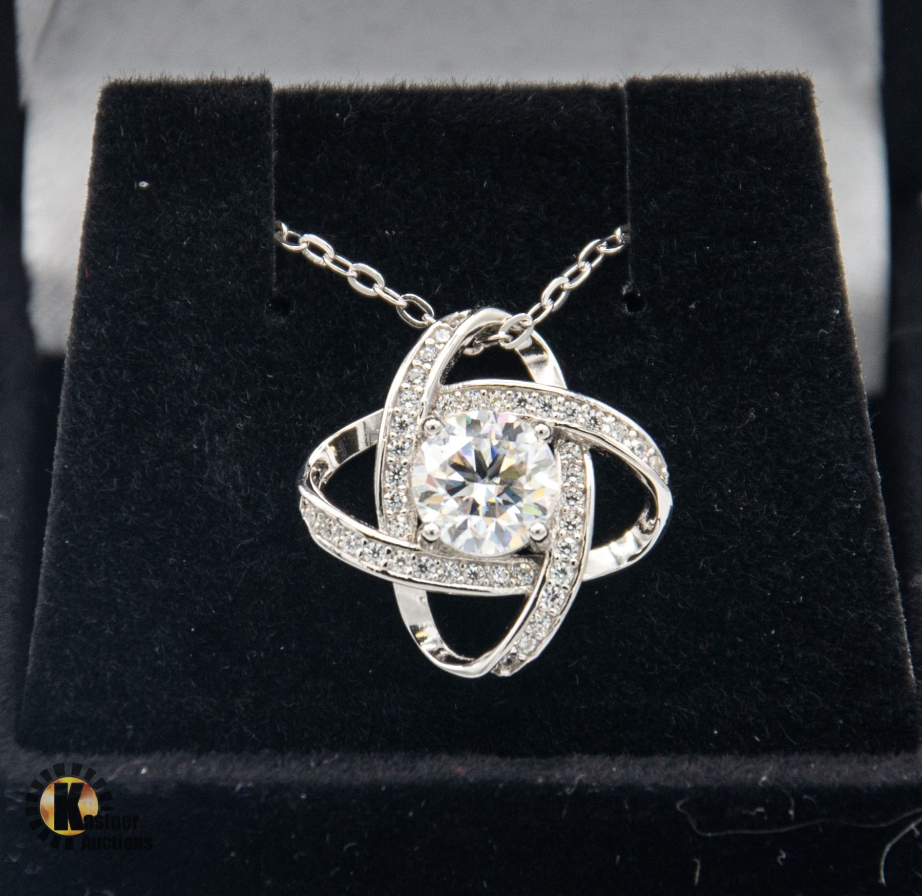 MOISSANITE STONE VVS D COLOR WITH 39 ROUND BRILLIANT CUT CUBIC ZIRCONIA SET IN DUAL HALO SET IN 925 SILVER PENDANT RETAIL VALUE $675.00 **ALL ITEMS MUST BE REMOVED BY 5PM SATURDAY, FEBRUARY 8TH 2025. ALL REMAINING ITEMS WILL BE SUBJECT TO A $6.00 PER DAY STORAGE CHARGE. ANY ITEMS REMAINING AFTER MONDAY, MARCH 3RD 2025 WILL BE CONSIDERED FORFEITED. NO REFUNDS WILL BE ISSUED FOR FORFEITED ITEMS. TO SCHEDULE A PICK UP APPOINTMENT CLICK HERE