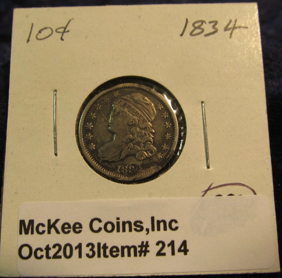 214. 1834 Capped Bust Dime. VF with scratches on nose. Redbook value $80.00 in VF.