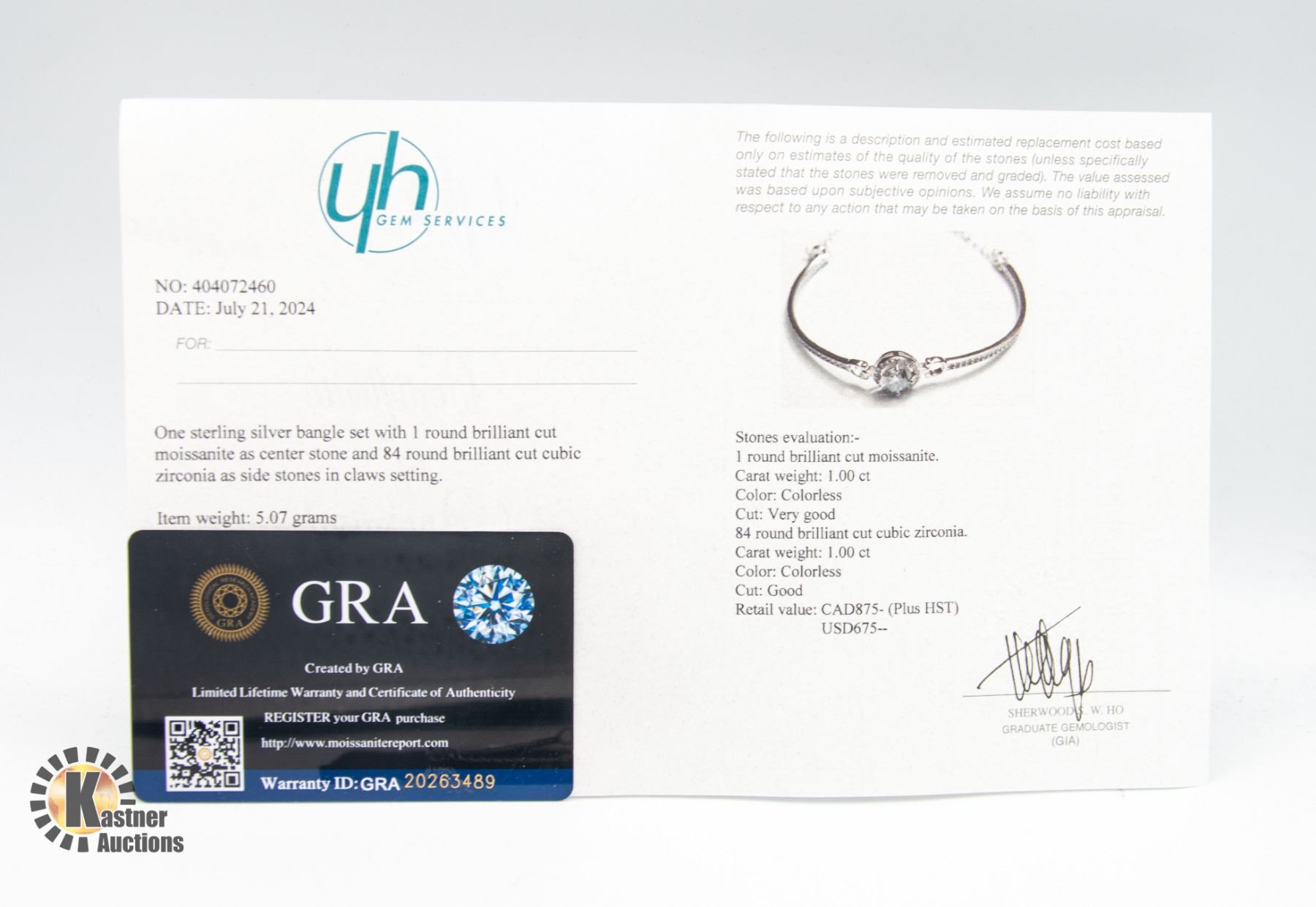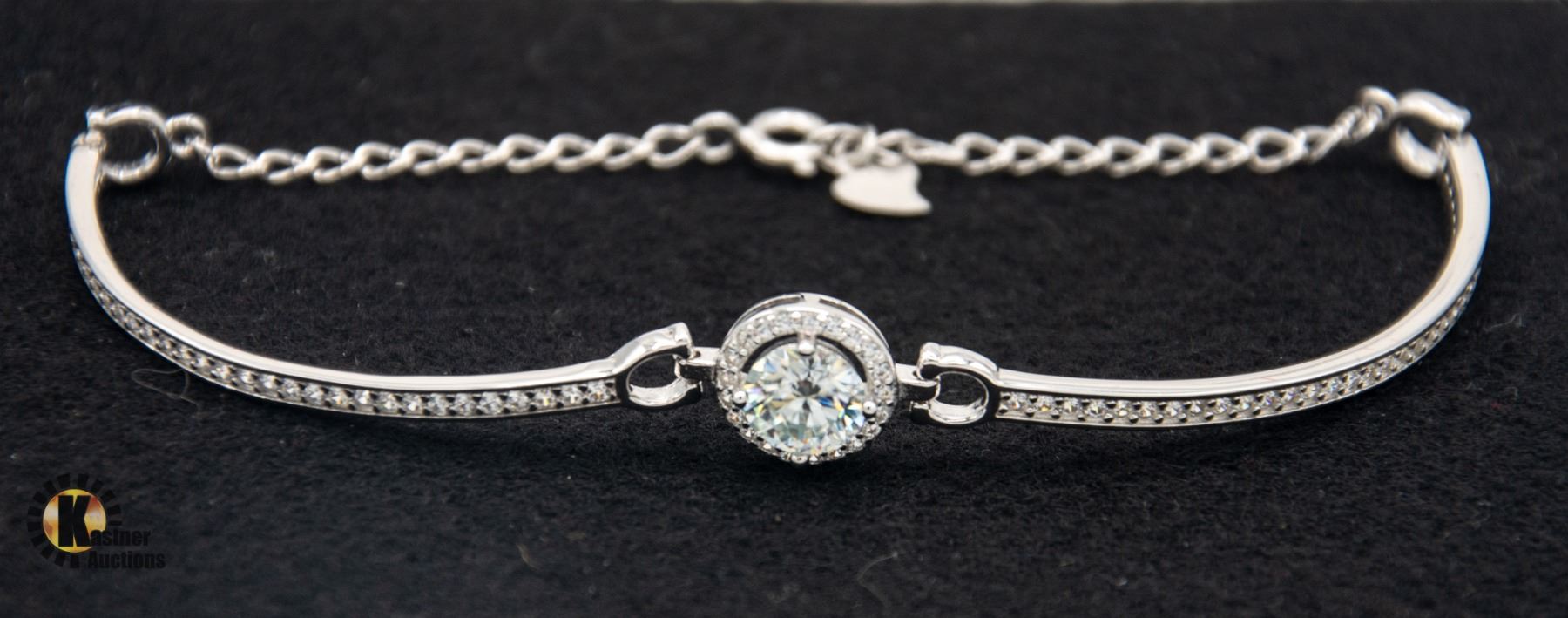 MOISSANITE STONE VVS D COLOR SET IN CENTER OF ROUND HALO WITH 84 ROUND BRILLIANT CUT CUBIC ZIRCONIA STONES SET IN HALO AND IN BANGLE SET IN 925 SILVER RETAIL VALUE $875.00 **ALL ITEMS MUST BE REMOVED BY 5PM SATURDAY, FEBRUARY 8TH 2025. ALL REMAINING ITEMS WILL BE SUBJECT TO A $6.00 PER DAY STORAGE CHARGE. ANY ITEMS REMAINING AFTER MONDAY, MARCH 3RD 2025 WILL BE CONSIDERED FORFEITED. NO REFUNDS WILL BE ISSUED FOR FORFEITED ITEMS. TO SCHEDULE A PICK UP APPOINTMENT CLICK HERE