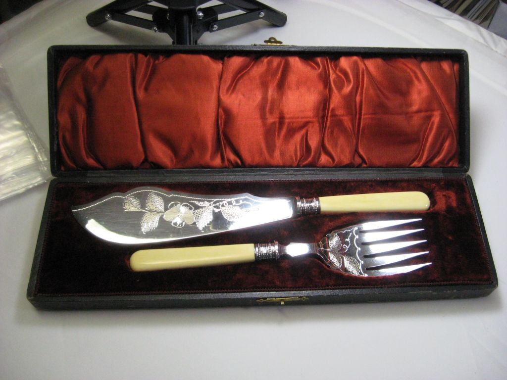 2147 - Bone handled Serving knife and fork in original box hallmarded EPbox hallmarded EP
