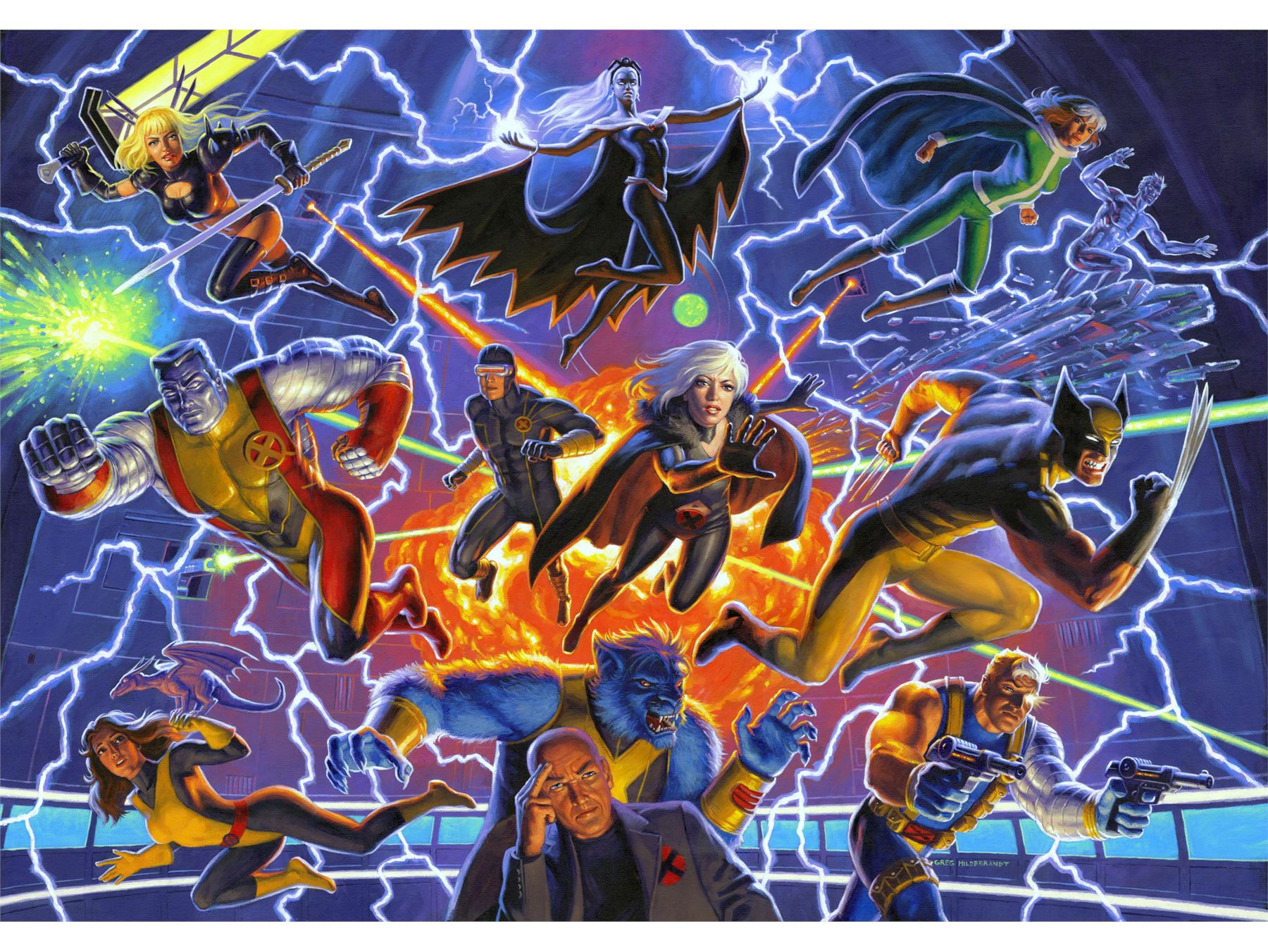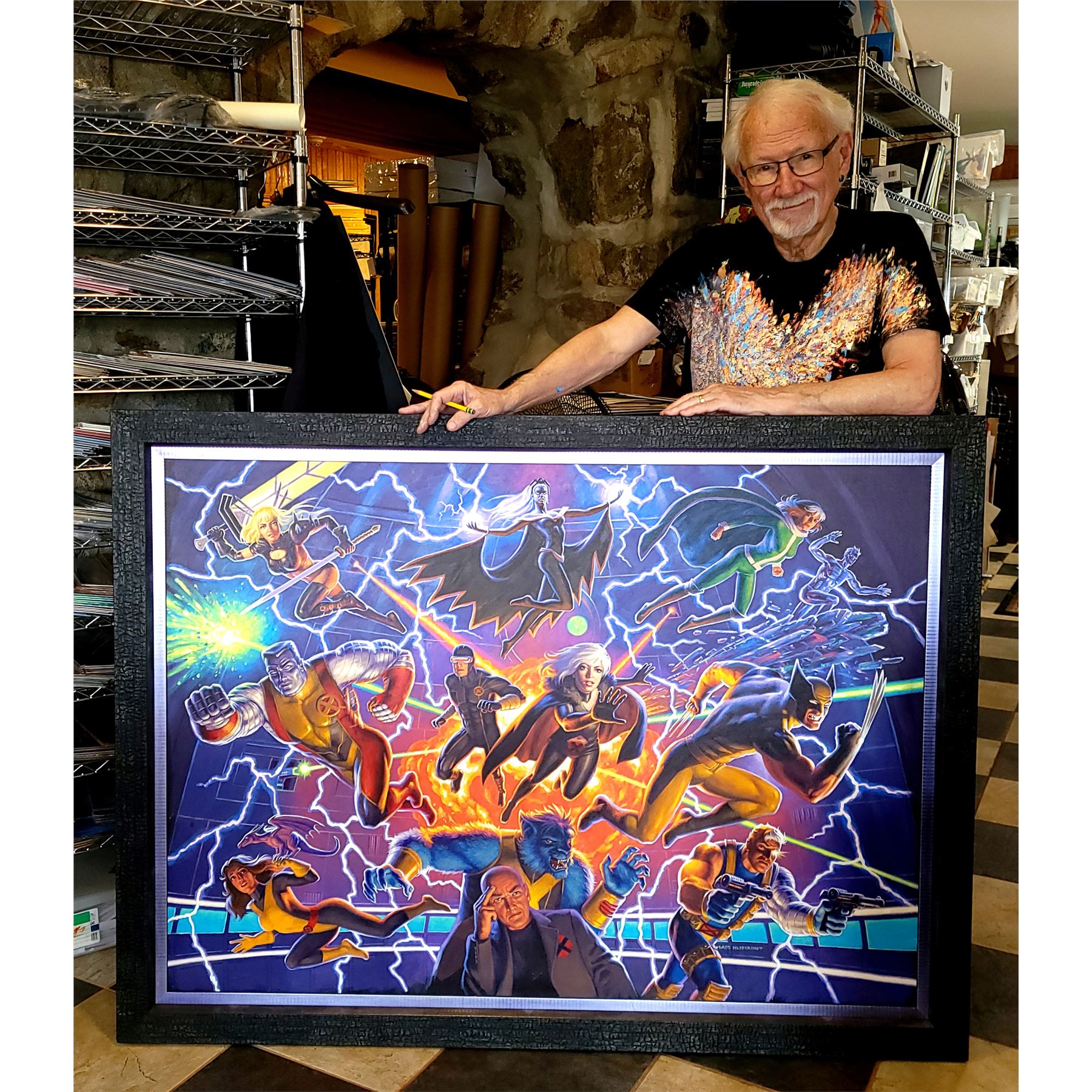 MARVEL COMICS - Framed Hand-Painted Greg Hildebrandt 2018 Fleer Ultra X-Men Team 3" x 3" Nine-Block Connected Card Set Painting - A framed painting for Fleer's Ultra X-Men trading card set hand-painted by legendary sci-fi and fantasy artist Greg Hildebrandt. Released in 2018, the full set included a rare 3" x 3" nine-block connected card "puzzle" set featuring the full X-Men team. This painting for the puzzle set was the first created by Hildebrandt for an X-Men trading card since the mid-1990s, when he and his brother Tim designed cards in the Marvel Masterpieces series.