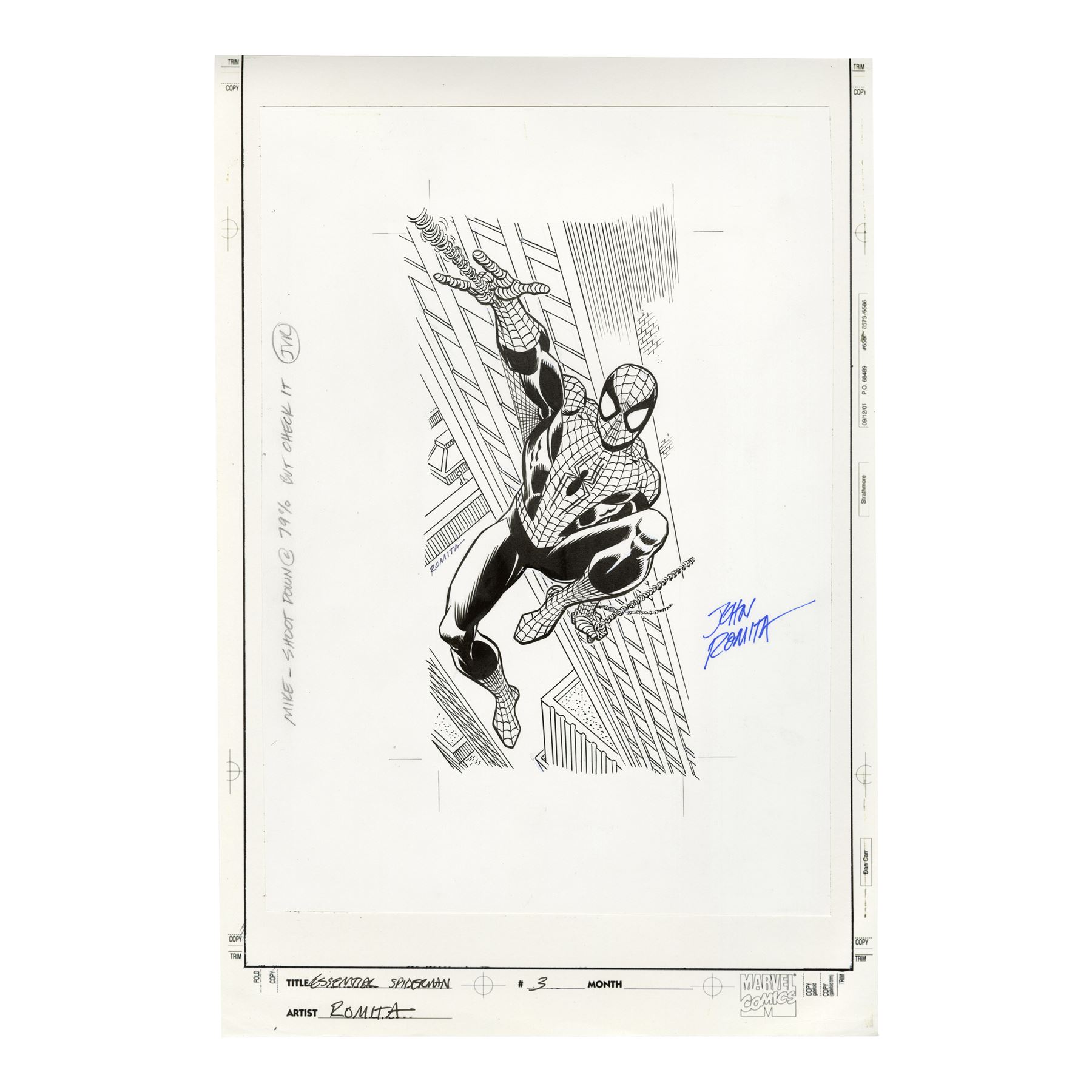 This cover illustration of Spider-Man swinging through New York is penciled, inked, and signed in two places by Romita with "Essential Spiderman" and "3" hand-labeled on the bottom. An overlay with the logo and cover-dressing were added after-production for display purposes. Also included are printed copies of two different versions of the final cover. The illustration exhibits ink bleed on the reverse and one printed cover is warped and creased. Dimensions: (largest) 11" x 17" (28 cm x 43.25 cm)