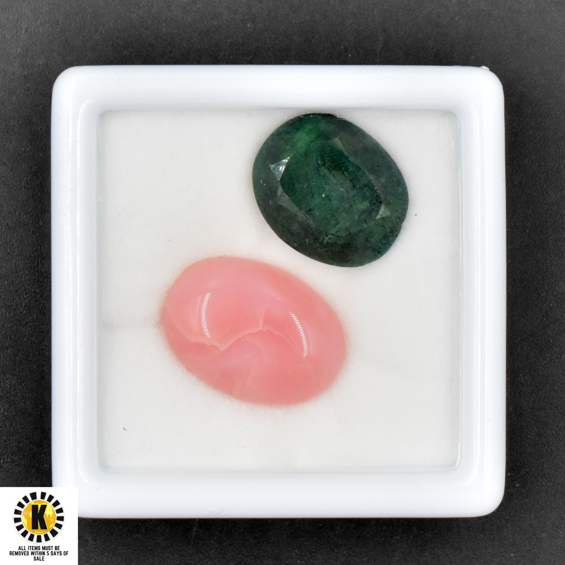 #216-NATURAL PINK OPAL 8.95CTCT, EMERALD 6.90CT