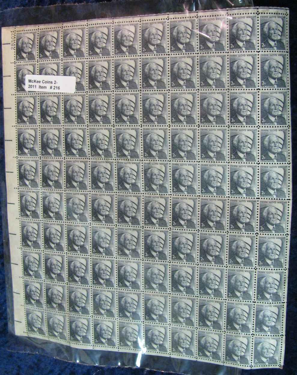 216. Original Mint Sheet of Frank Lloyd Wright 2c Stamps. (100 stamps).