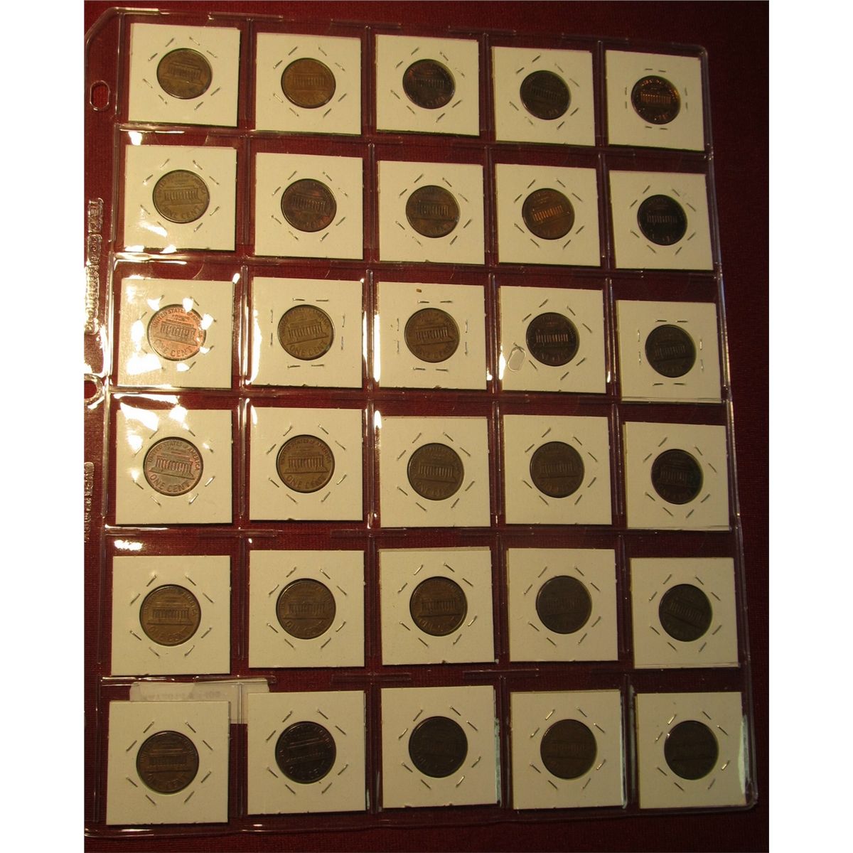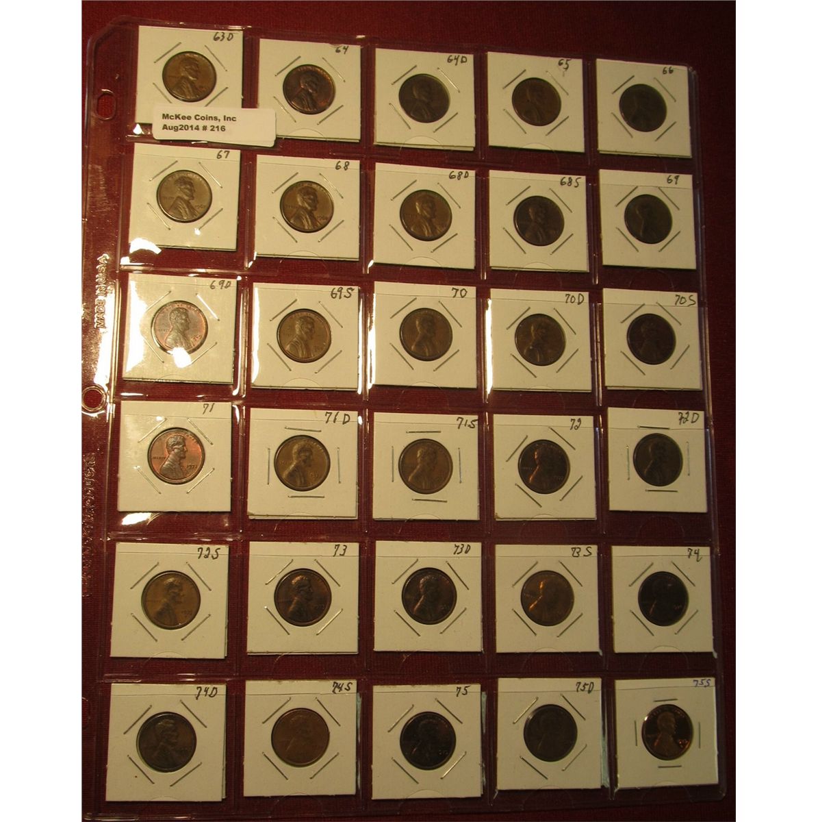 216. Plastic Stock page containing (30) Lincoln Cents in 1 1/2" x 1 1/2" holders. Includes some Proofs dating from 1963 up to 1975 S Proof.