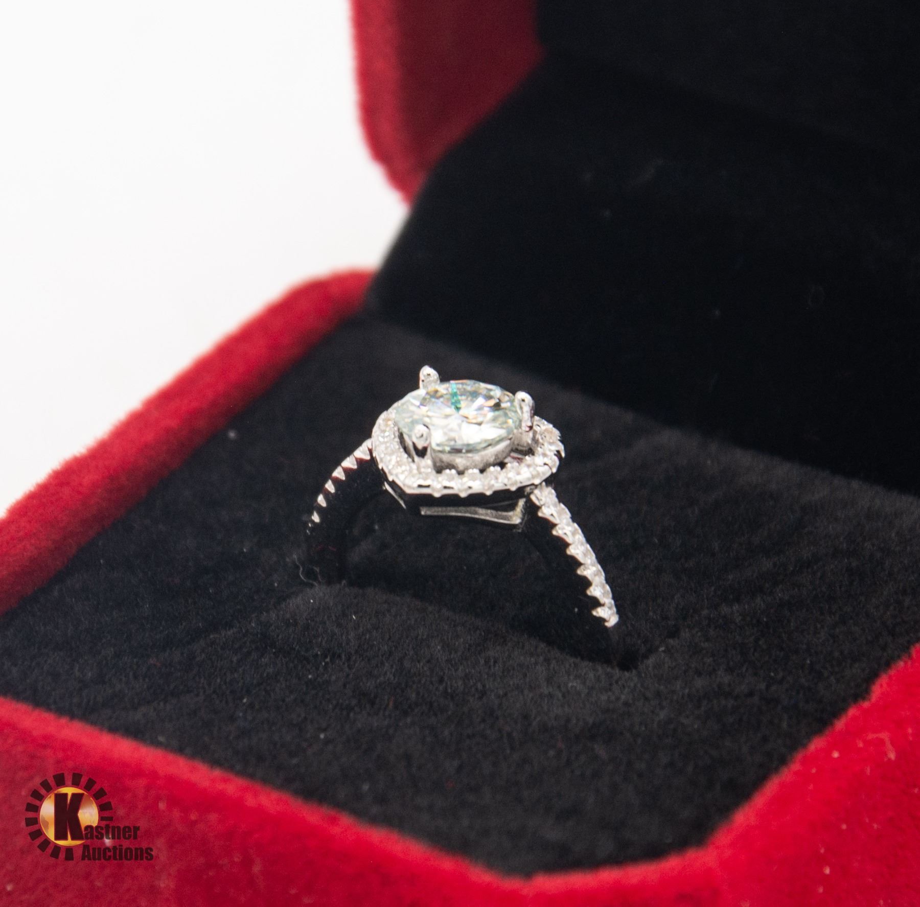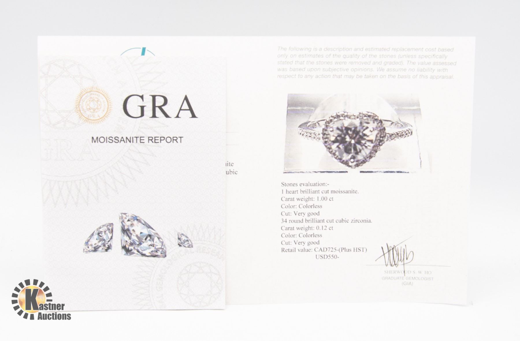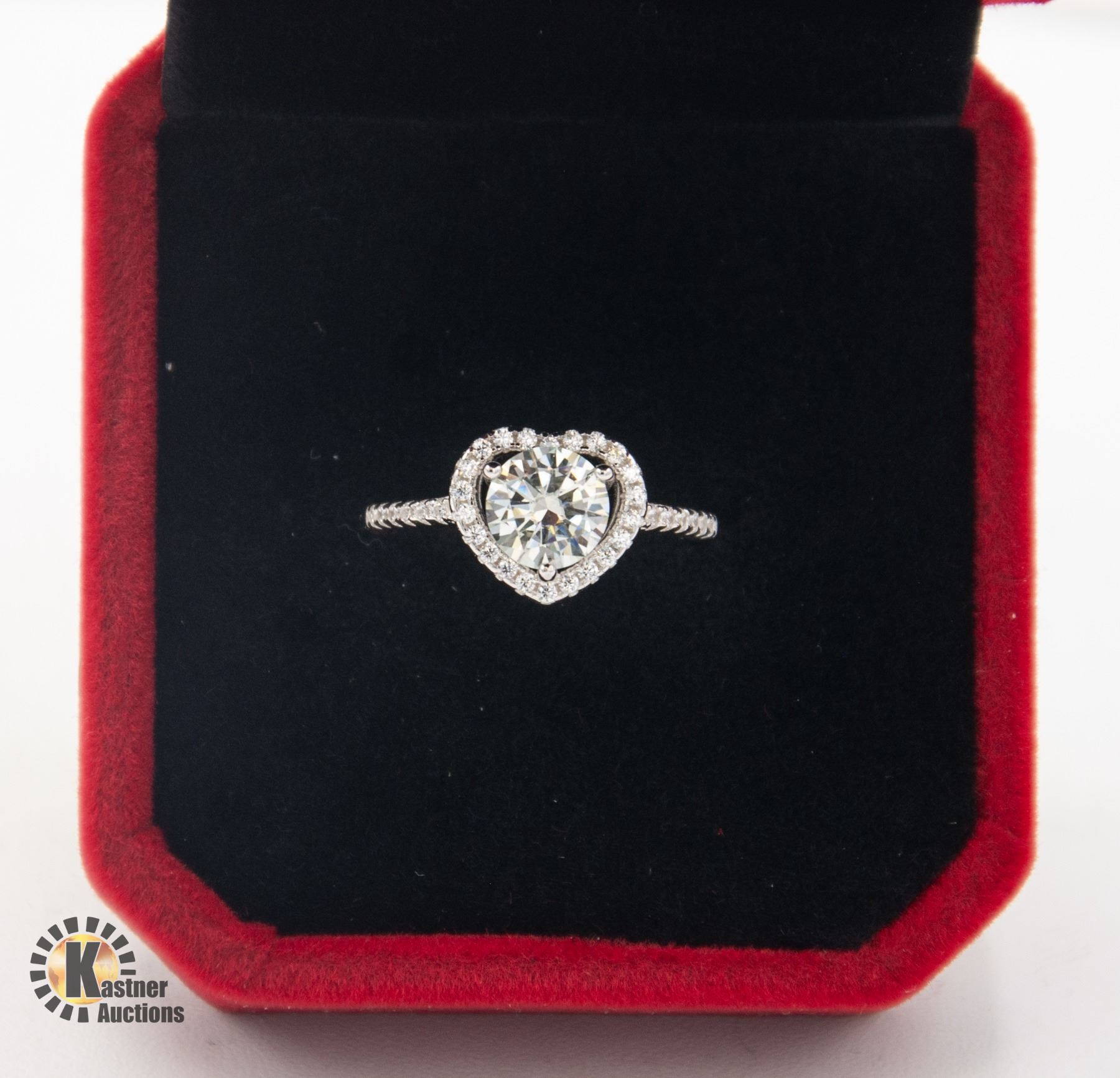 MOISSANITE STONE VVS D COLOR SET IN CENTER OF HEART SHAPED HALO WITH 34 ROUND BRILLIANT CUT CUBIC ZIRCONIA ALSO SET ON EITHER SHANK SET IN 925 SILVER RING SIZE 4.75 RETAIL VALUE $725.00 **ALL ITEMS MUST BE REMOVED BY 5PM SATURDAY, FEBRUARY 15TH 2025. ALL REMAINING ITEMS WILL BE SUBJECT TO A $6.00 PER DAY STORAGE CHARGE. ANY ITEMS REMAINING AFTER MONDAY, MARCH 10TH 2025 WILL BE CONSIDERED FORFEITED. NO REFUNDS WILL BE ISSUED FOR FORFEITED ITEMS. TO SCHEDULE A PICK UP APPOINTMENT CLICK HERE