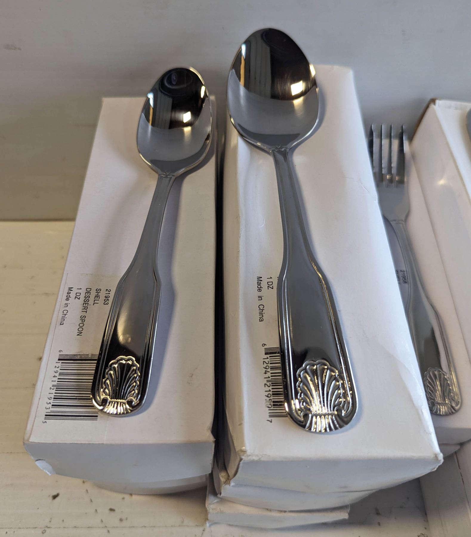 INCLUDES: 36 NEW SHELL TABLESPOONS, 36 NEW SHELL DESSERT SPOONS, 36 NEW SHELL SALAD FORKS, 36 NEW NIAGARA DINNER KNIVES, 36 NEW NIAGARA ICED TEASPOONS, & 36 NEW ATLANTIS OYSTER FORKS