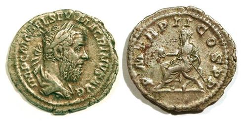 Macrinus 217-218. Reverse; Macrinus seated left on curved chair, #S7341.