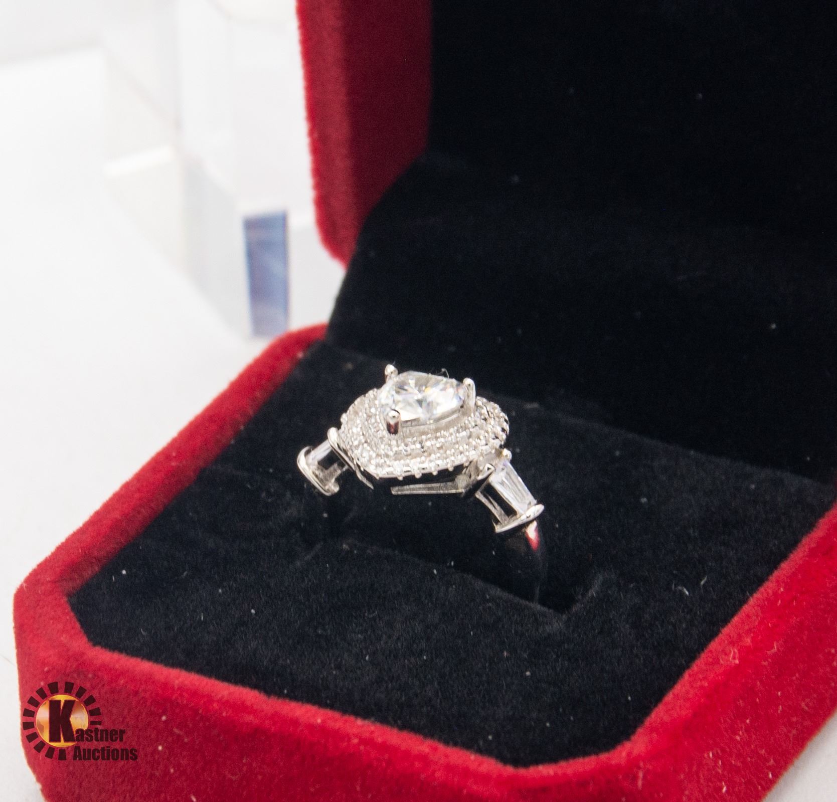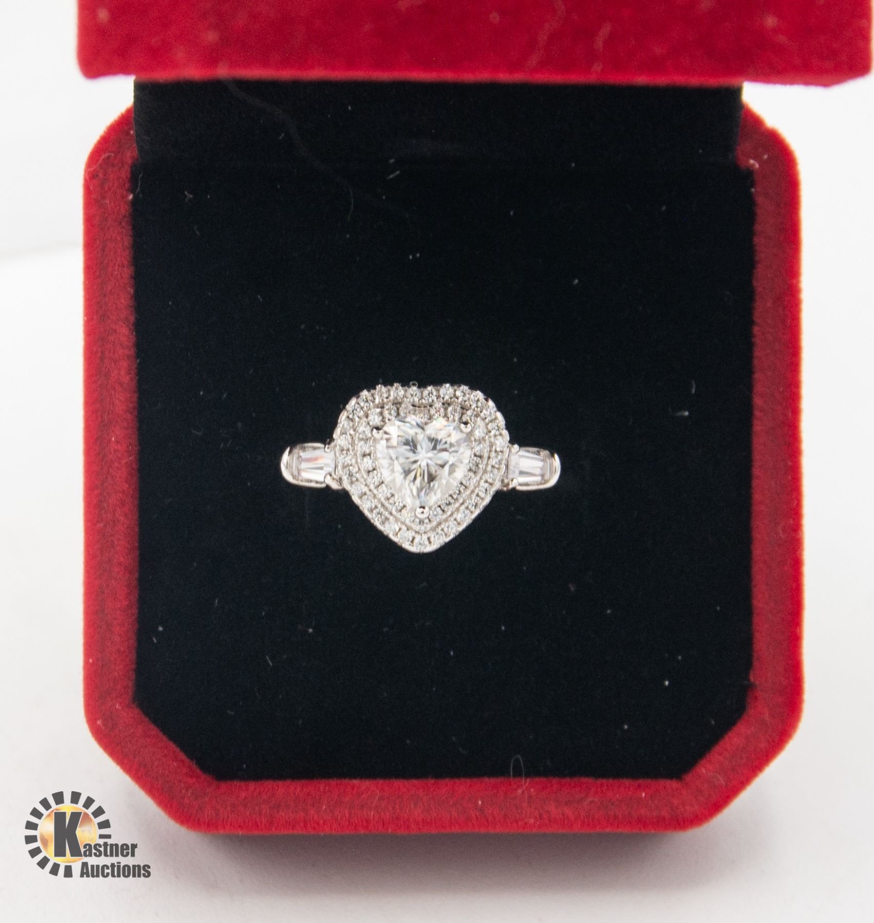 COLOR WITH 52 ROUND BRILLIANT CUT CUBIC ZIRCONIA SET IN DUAL HEART SHAPED HALOS WITH TAPERED BAGUETTE SET ON EITHER SIDE OF HEART SHAPE SET IN 925 SILVER RING SIZE 4.5 **ALL ITEMS MUST BE REMOVED BY 5PM SATURDAY, FEBRUARY 15TH 2025. ALL REMAINING ITEMS WILL BE SUBJECT TO A $6.00 PER DAY STORAGE CHARGE. ANY ITEMS REMAINING AFTER MONDAY, MARCH 10TH 2025 WILL BE CONSIDERED FORFEITED. NO REFUNDS WILL BE ISSUED FOR FORFEITED ITEMS. TO SCHEDULE A PICK UP APPOINTMENT CLICK HERE