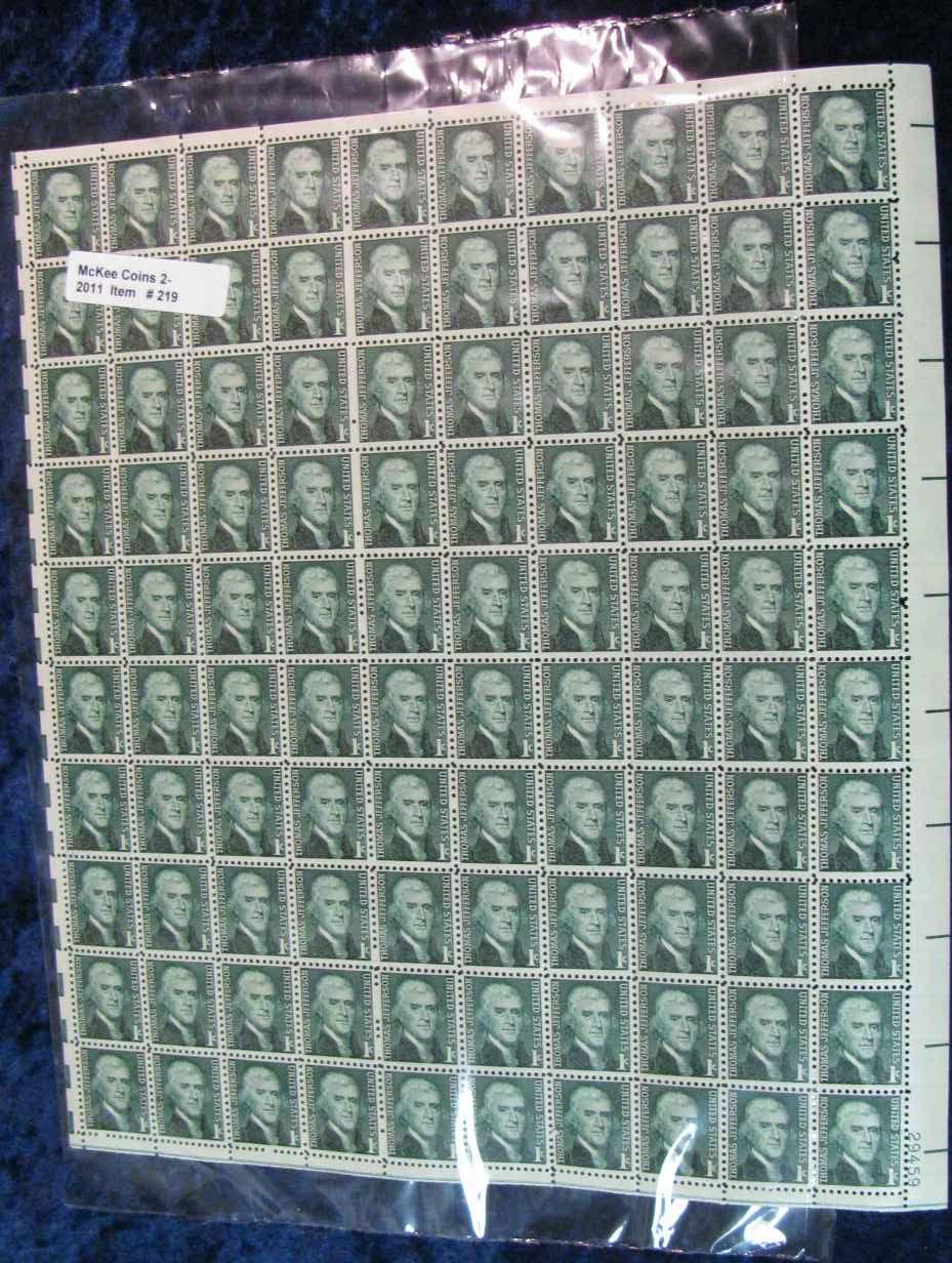 219. Original Mint Sheet of Thomas Jefferson 1c Stamps. (100 stamps).