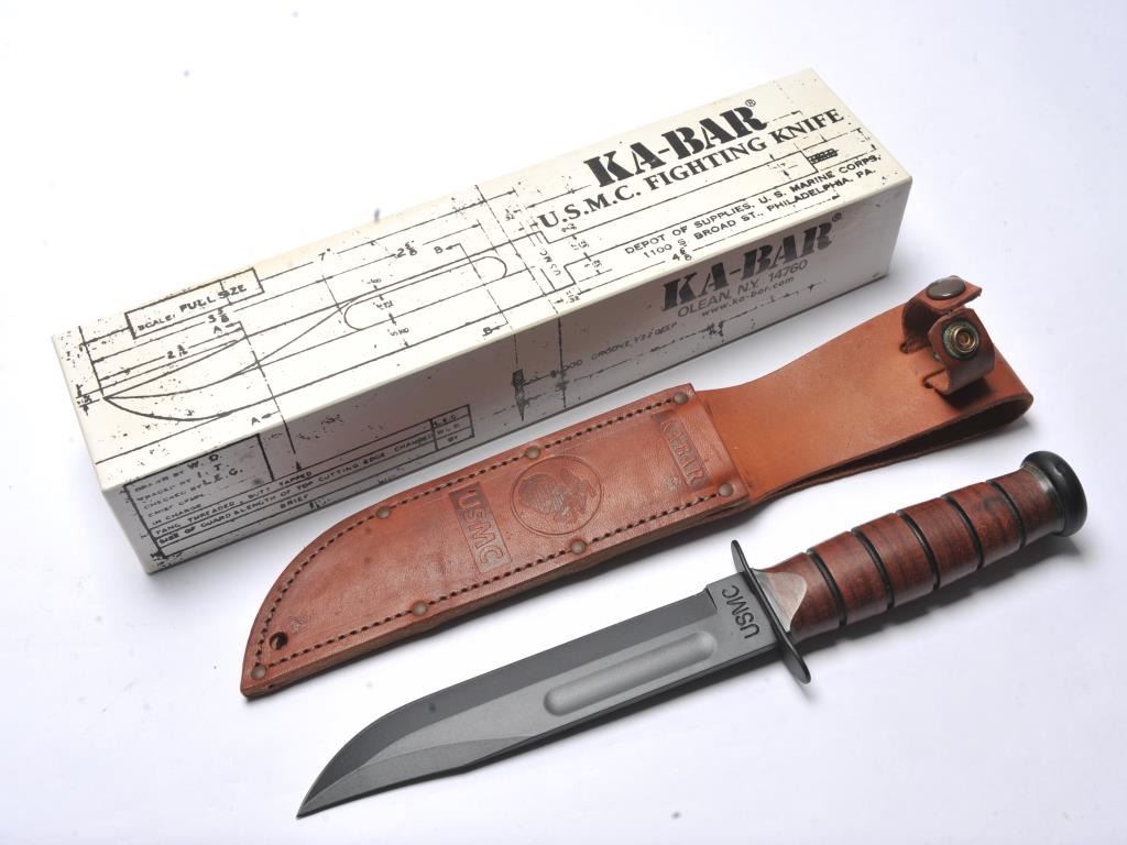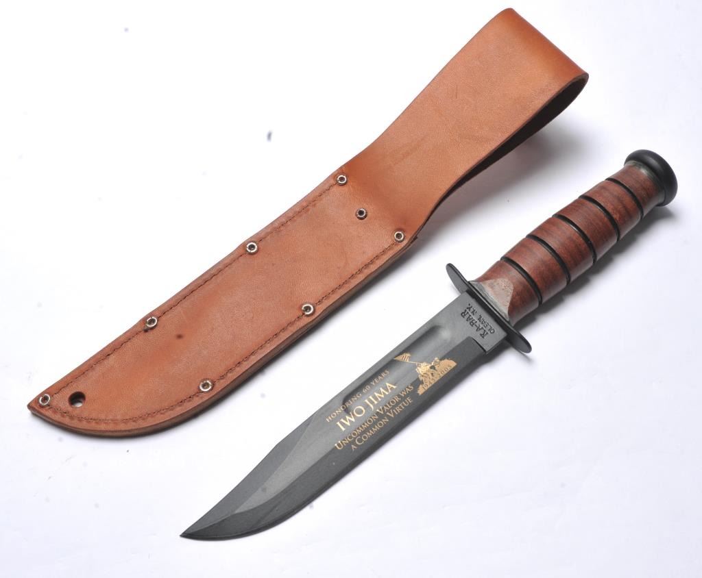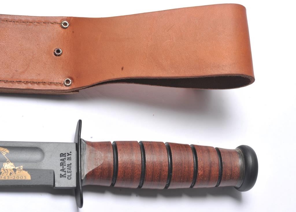 KA-BAR Iwo Jima Commemorative knife with leather scabbard in the original factory box. The knife a black blade marked in gold, “HONORING 60 YEARS IWO JIMA UNCOMMON VALOR WAS A COMMON VIRTUE 1945-2005”. The knife is as new with KA-BAR at the handguard and USMC on the reverse. Est.: $75-$150.