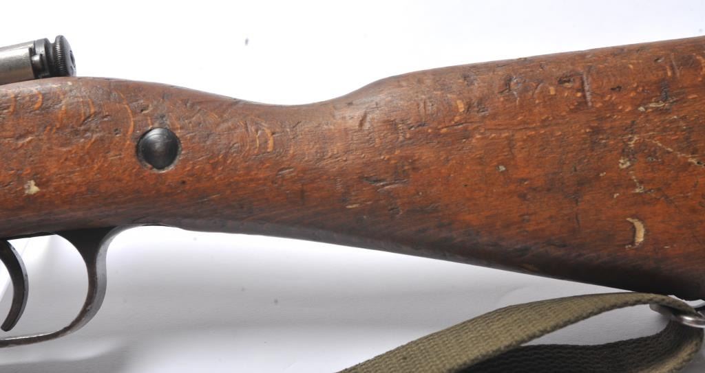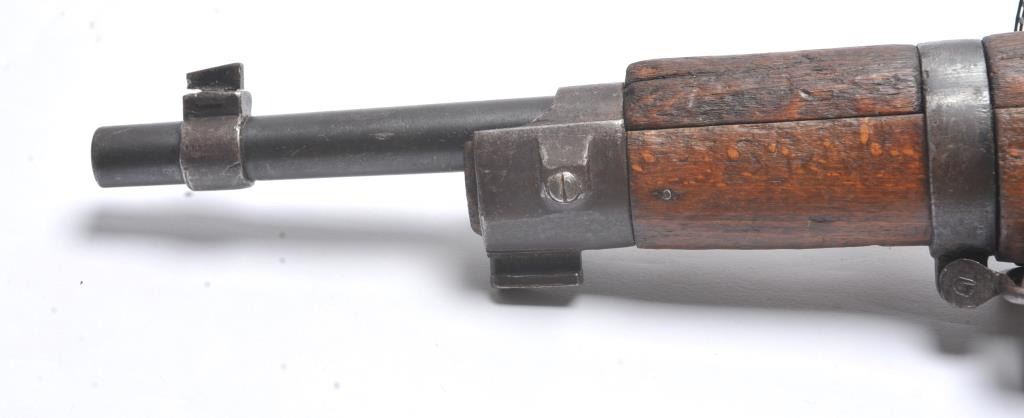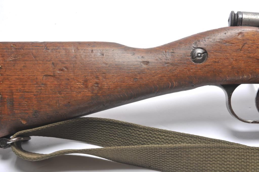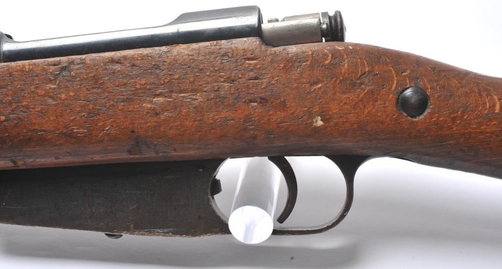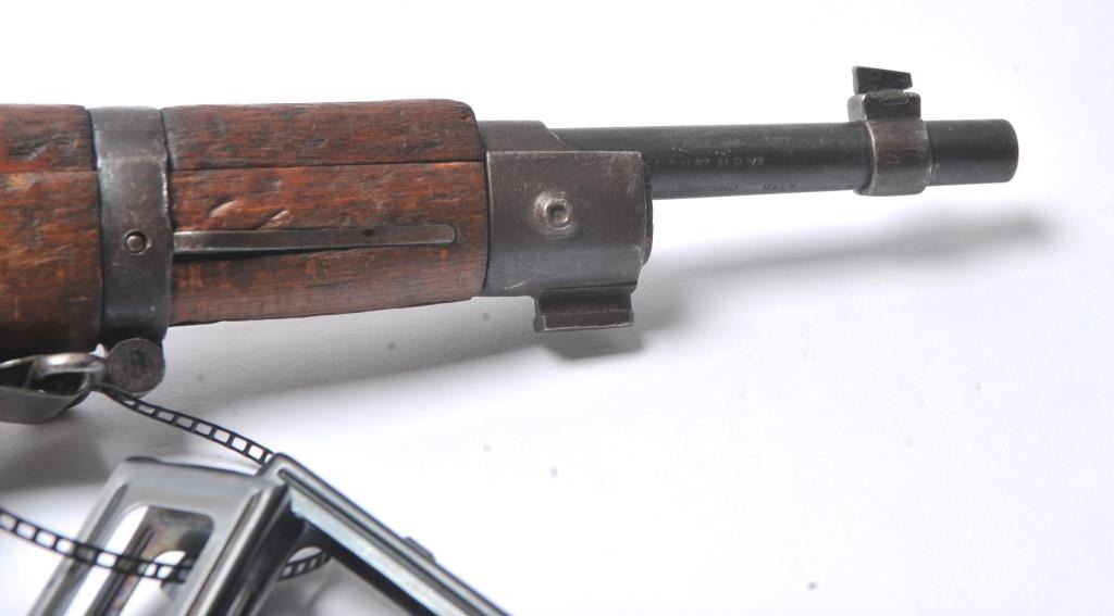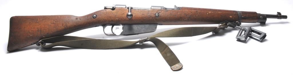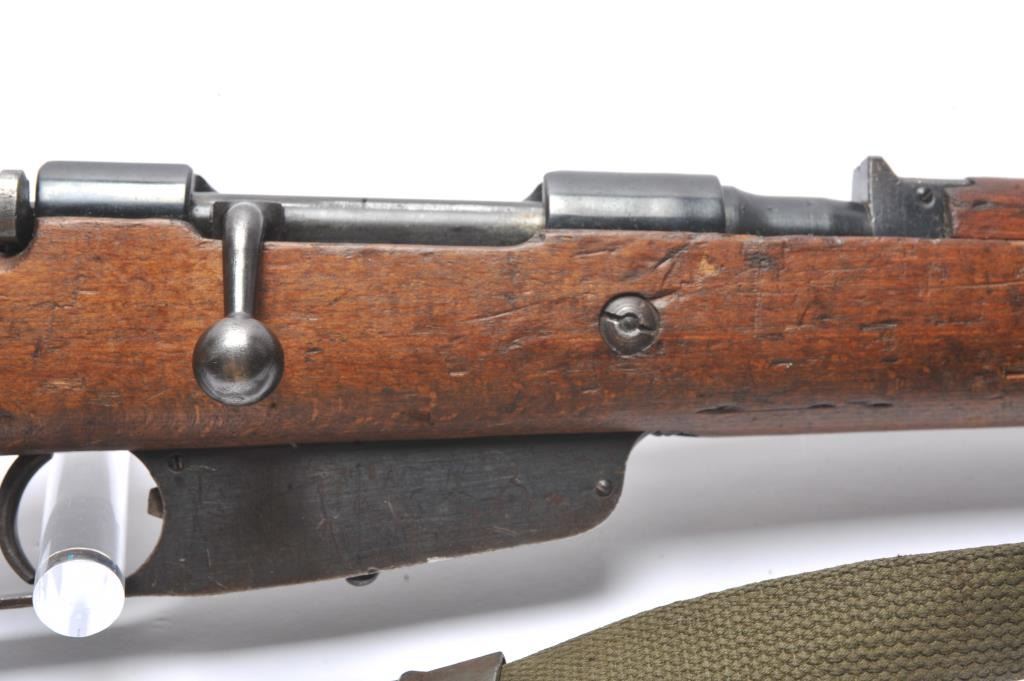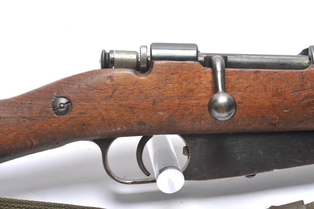 Italian Carcano Model 91 TS bolt action carbine, 8mm Mauser caliber, Serial #RA0929. The carbine is in good overall condition with an 18” import marked barrel which has been re-chambered to the 8mm Mausercartridge. The smooth wood stock shows heavy use with dents and compressions consistent with service use. There are proofs and rack marks on the left side of the butt stock with sling swivels and a period canvas sling.The bore is fair and action functions. Est.: $200-$400. (C+R/PPT).