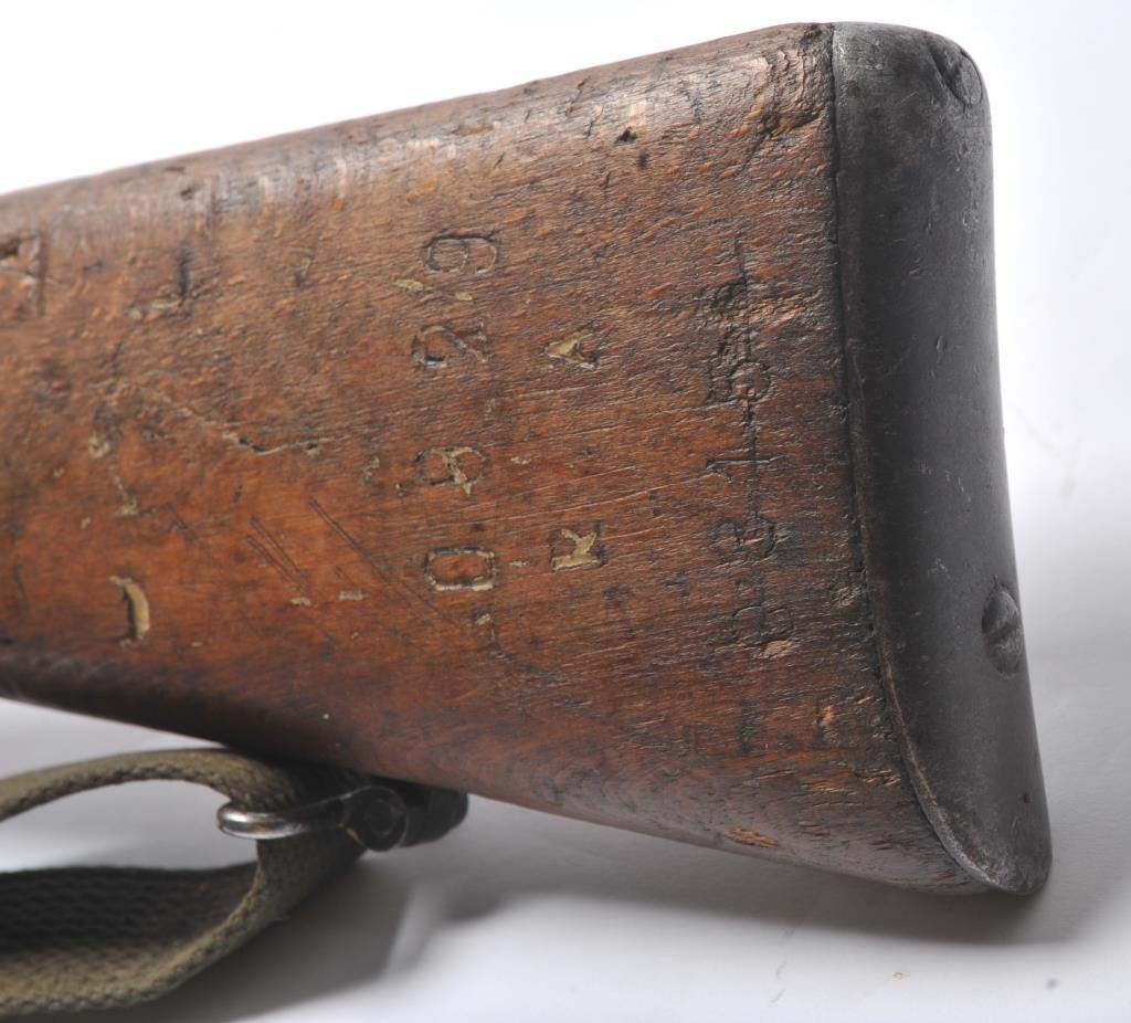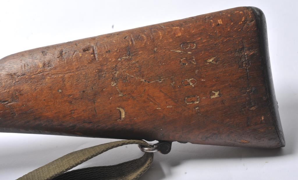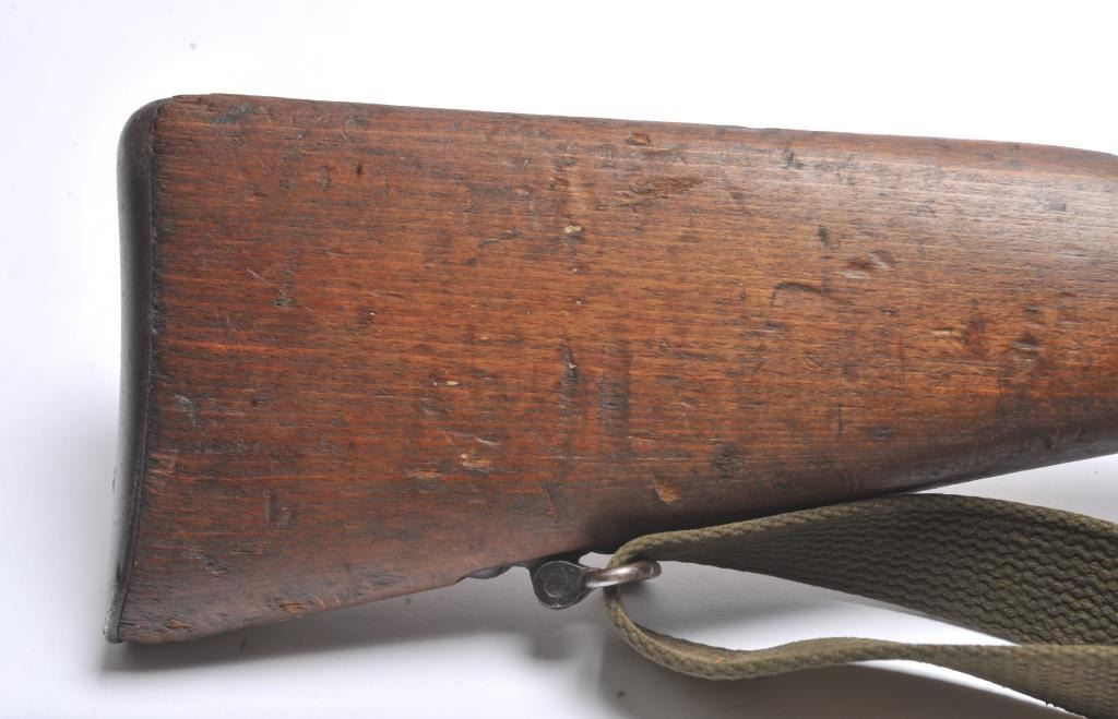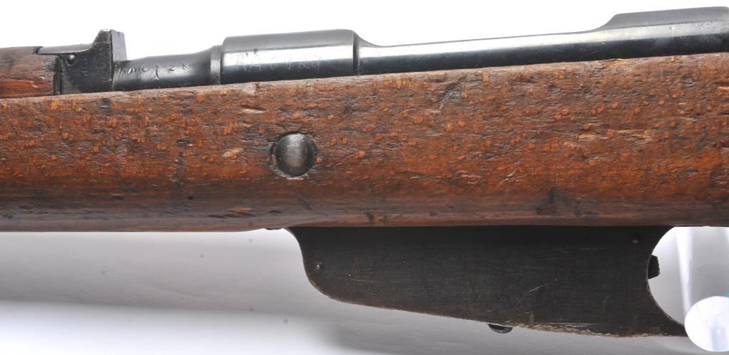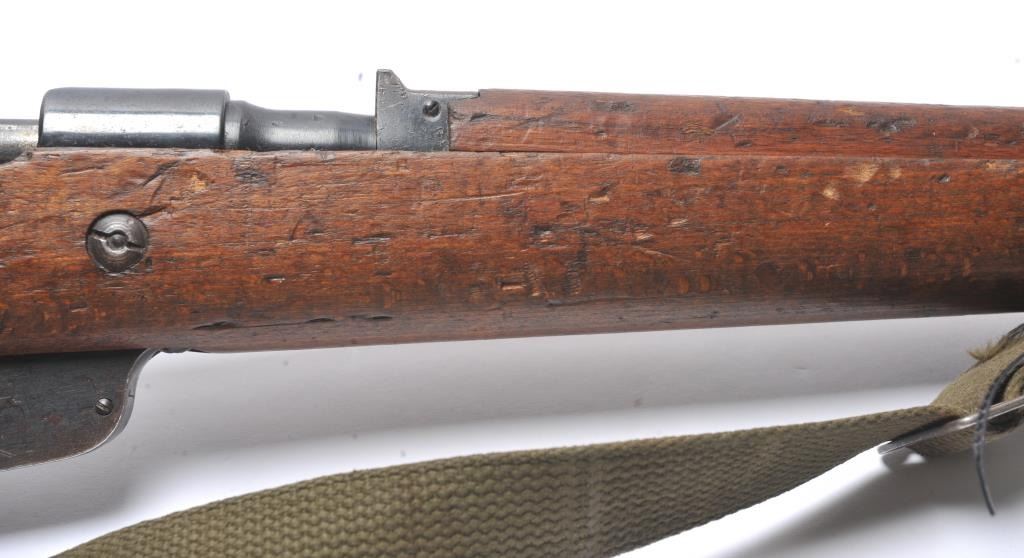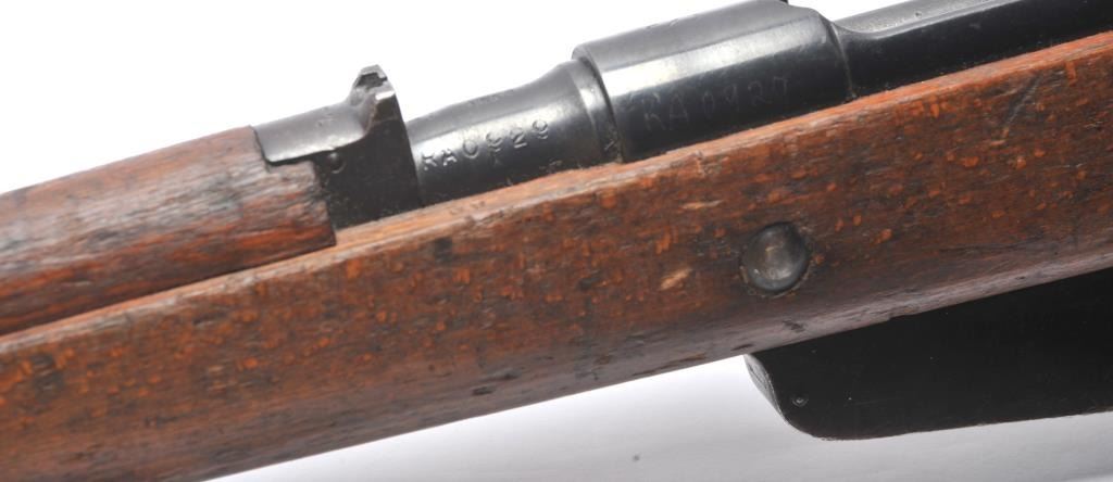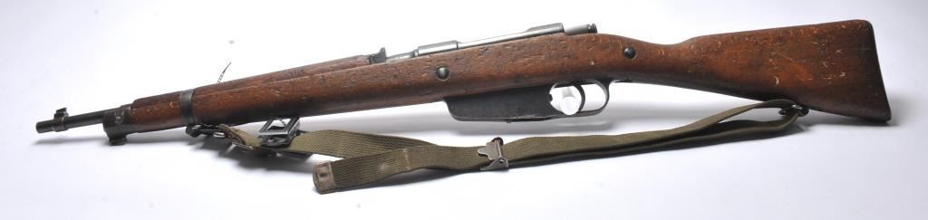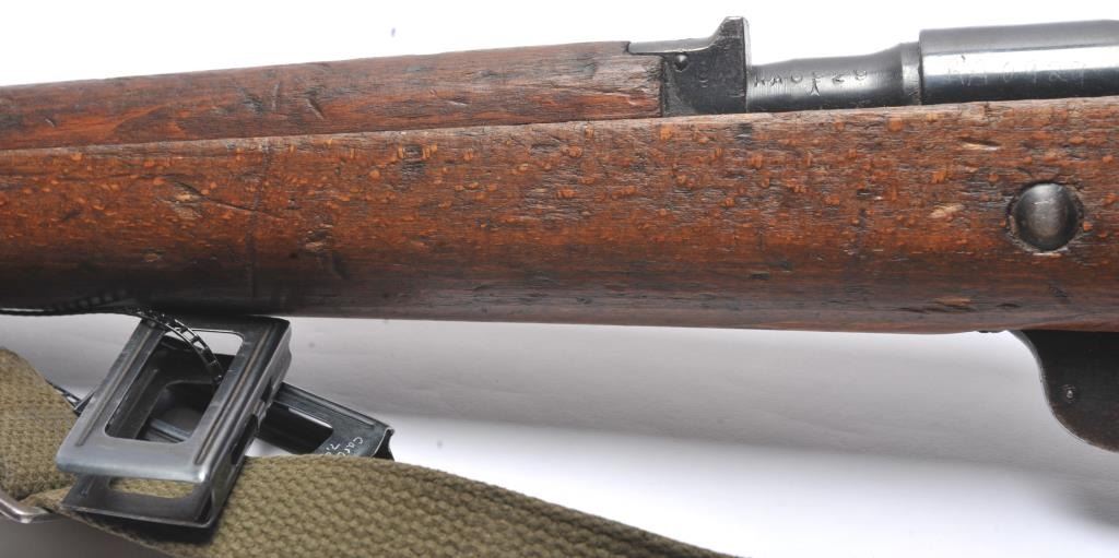 Italian Carcano Model 91 TS bolt action carbine, 8mm Mauser caliber, Serial #RA0929. The carbine is in good overall condition with an 18” import marked barrel which has been re-chambered to the 8mm Mausercartridge. The smooth wood stock shows heavy use with dents and compressions consistent with service use. There are proofs and rack marks on the left side of the butt stock with sling swivels and a period canvas sling.The bore is fair and action functions. Est.: $200-$400. (C+R/PPT).